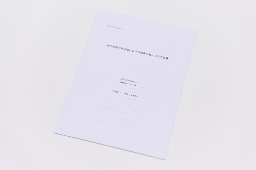 本研究は、映画館という身近でありながら先行研究の少ない場面に着目し、座席行動を状況要因、同行者との関係性、年齢差という複数の観点から立体的に検討した点で、他の卒業研究と比較しても独創性と完成度が際立っている。とりわけ、日常的な行動の背後にある心理過程を捉えようとした着眼点は優れており、公共空間における対人距離や発達段階の違いを映画館という具体的場面に結び付けた点は高く評価できる。研究手法においても、自作の座席図を用いた質問紙により回答を具体化し、10代から50代まで計120名のデータを収集したうえで、自由記述と統計的検討を組み合わせ、多面的で説得力のある分析を実現している。さらに、映画館における快適な環境設計やサービス改善への示唆を含み、社会的意義も大きい。学術的にも、座席行動研究に新たな対象と視点を加える成果である。研究過程においても、調査・分析・執筆の各段階に粘り強く誠実に取り組み、2万字を超える論文として丁寧に完成させた姿勢は特に優れている。着眼点、方法、意義、完成度のいずれをとっても本学の卒業研究を代表する水準に達しており、学長賞に強く推薦する。
