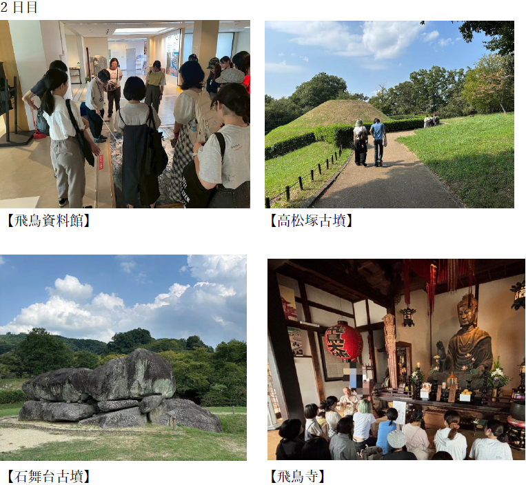2日目は飛鳥方面へ。飛鳥資料館、キトラ古墳、高松塚古墳、石舞台古墳、飛鳥寺を巡りました。各所で解説をしていただき、学びを深めることができました。