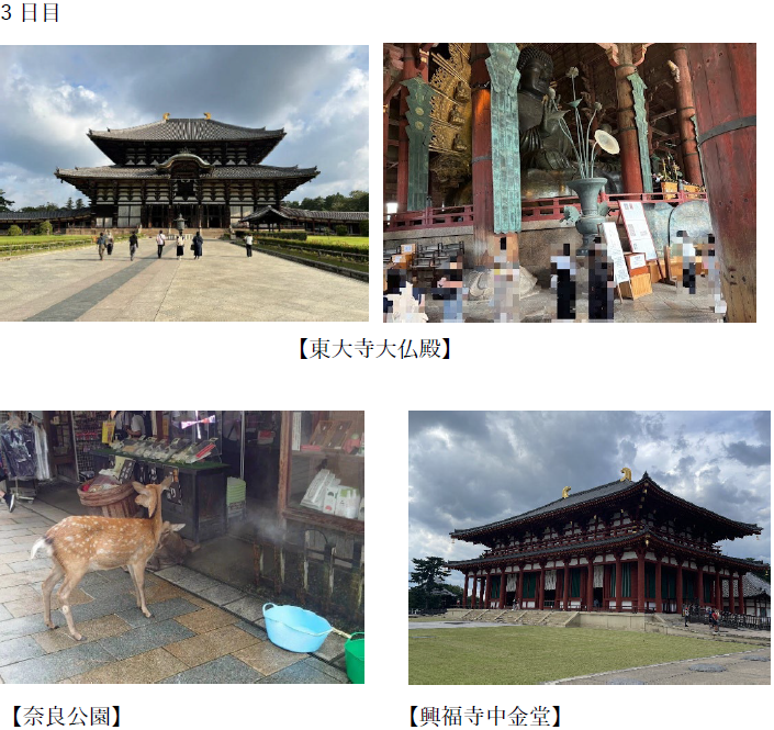 3日目は東大寺、興福寺、奈良国立博物館を訪れました。ガラス越しではなく、お寺の堂内で仏像を間近に拝観することができ、大変貴重な経験となりました。