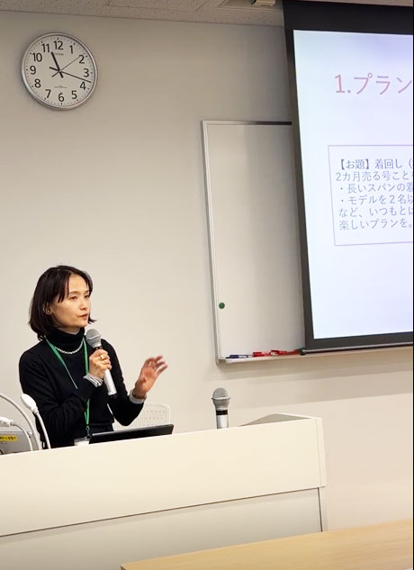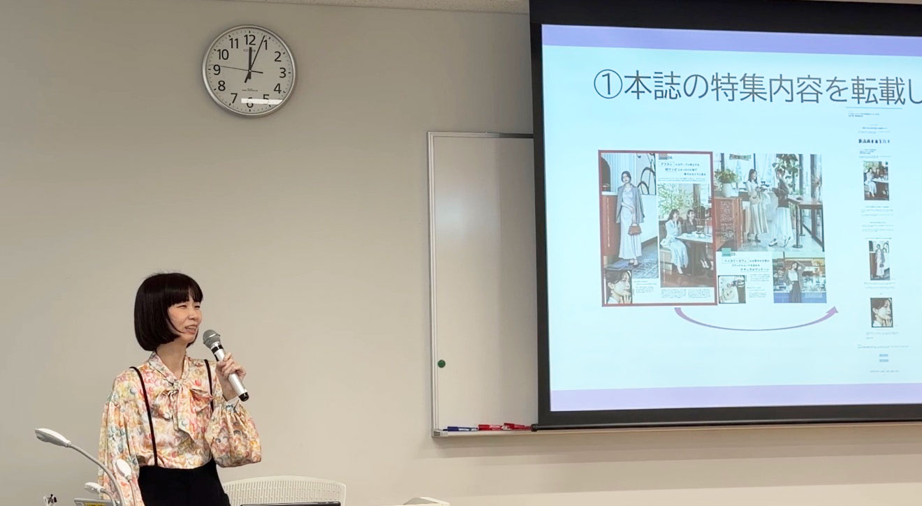後半は、中込編集長から「雑誌」「Web」「SNS」それぞれのメディア特性の強みと弱みを補い合いながら、ひとつのブランドとして読者にアプローチしていく現在の編集のあり方が語られました。また、現役大学生約150名が参加する「non-no大学生エディターズ」の存在も紹介され、大学生のリアルな声が誌面やWeb記事づくりの重要なヒントになっていることが強調されました。
