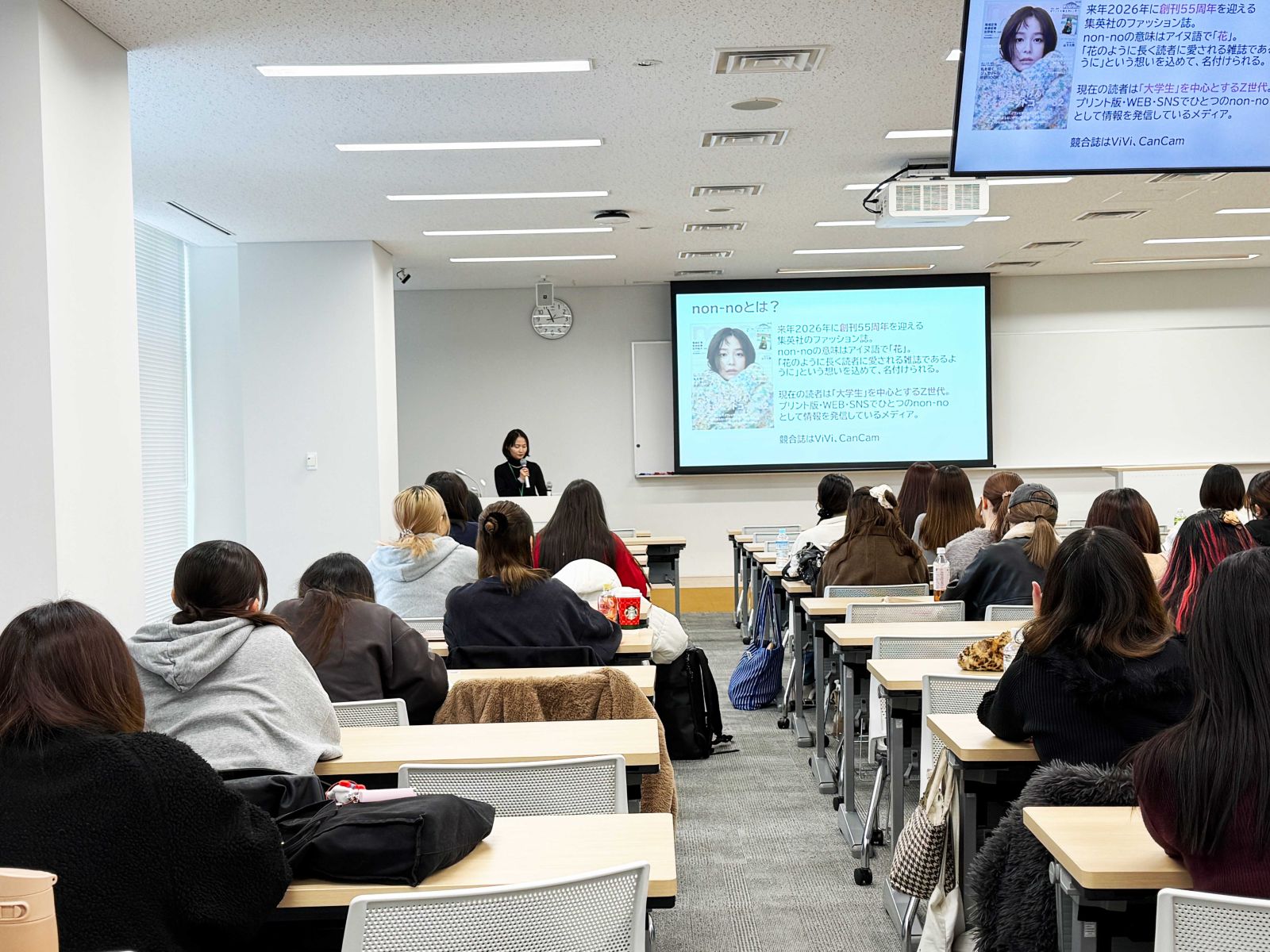 講義の前半では、中川編集長から『non-no』という雑誌の成り立ちと現在のポジションが紹介されました。『non-no』は2026年に創刊55周年を迎える集英社のファッション誌で、現在の主な読者は大学生を中心とするZ世代です。紙の雑誌、Webサイト、SNSを横断する「ひとつのnon-noブランド」として情報発信を行っている点が強調されました。