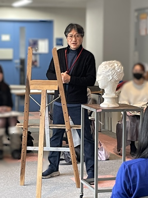 講義では「鉛筆デッサンを中心としたワークショップ形式の講義」と題して、鉛筆デッサンの心構えから、手法、理論まで幅広く、初心者にもわかりやすく解説いただきました。後半には、石膏像を前にしてより実践的なお話をうかがい、鉛筆デッサン実習を行いました。