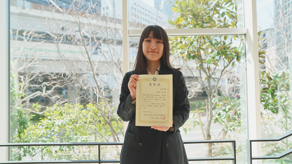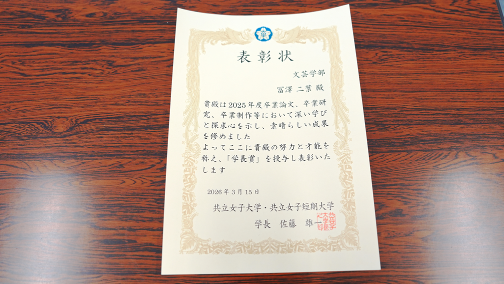 優秀な論文と作品を表彰する「学長賞」。文芸学部 文芸学科からは冨澤 二葉さんが選出されました。