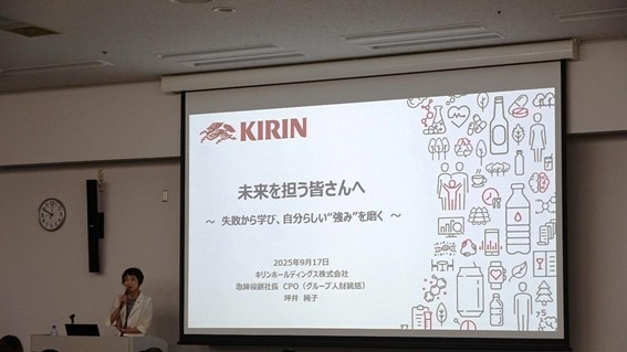 坪井教授は、人間固有の価値として「問いを立てる力」「意思決定の力」「構想力」を挙げ、AIが合理的判断を代替し得る一方で、リスクを伴う決断や価値観に基づく選択は人間にしか担えないことを強調されました。VUCA(変動性、不確実性、複雑性、曖昧性)の状況下では、リベラルアーツ的・哲学的基盤を持つことが不可欠であり、失敗からの学びを自己の強みに変えていくこと、タイパ・コスパとは次元の異なる尺度で人間的な深み、余白を持つことの大切さを示されました。また、リーダーシップの本質を「本質を見抜く力」「共感する心」「率先して行動する勇気」の三位一体にあると強調され、「共立リーダーシップ」に通じる考えを披露されました。さらに、仕事を「行動」「成果」「意義」という三層で捉えることの意義が示され、社会的意味づけを伴う職務遂行が自己成長に直結することを説明されました。ご自身の経験をもとに、学生に対し、「学び続ける覚悟と挑戦する勇気」を持ち、多様性と失敗を恐れないキャリア形成を目指すようエールを送られました。