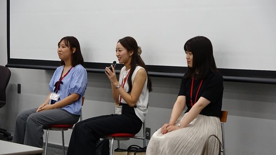 第2部では、社会人2年目となる第1期卒業生3名を招き、現在の仕事内容、労働環境(労働時間、有給取得、給与等)の満足度、就活内容、仕事をしていくうえで役立っている学生時代の経験(ゼミ・授業)等について赤裸々に語ってもらいました。