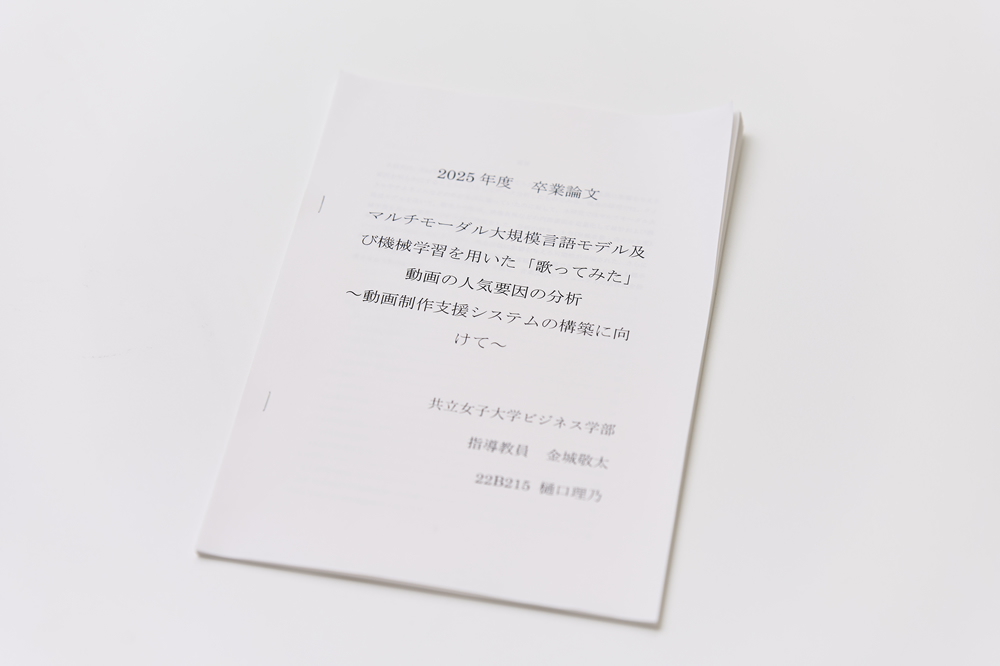 本研究は、YouTube上の「歌ってみた」動画という身近かつ将来性の高いデジタル創作領域を対象に、再生数の決定要因を多面的に分析した点で、他の論文と比較して着眼点の独自性が際立っている。外部要因中心であった先行研究に対し、マルチモーダル大規模モデルを活用して歌唱力や映像表現といった内部要因を定量化した点は方法論的に先進的であり、統計分析と機械学習を適切に組み合わせた設計・解釈も的確であった。さらに、分析結果を踏まえ制作支援の診断サイトを試作するなど、実践的含意を具体化しており、社会的波及可能性も高い。研究過程においても粘り強く検証を重ね、主体的に課題を設定・改善する姿勢が顕著であった。知識・技能・思考力・態度の各観点でアセスメント科目ルーブリックの到達目標を大きく上回り、他者と協働しながら成果を高める共立リーダーシップも十分に発揮されていた点を高く評価し、主席として推薦する。