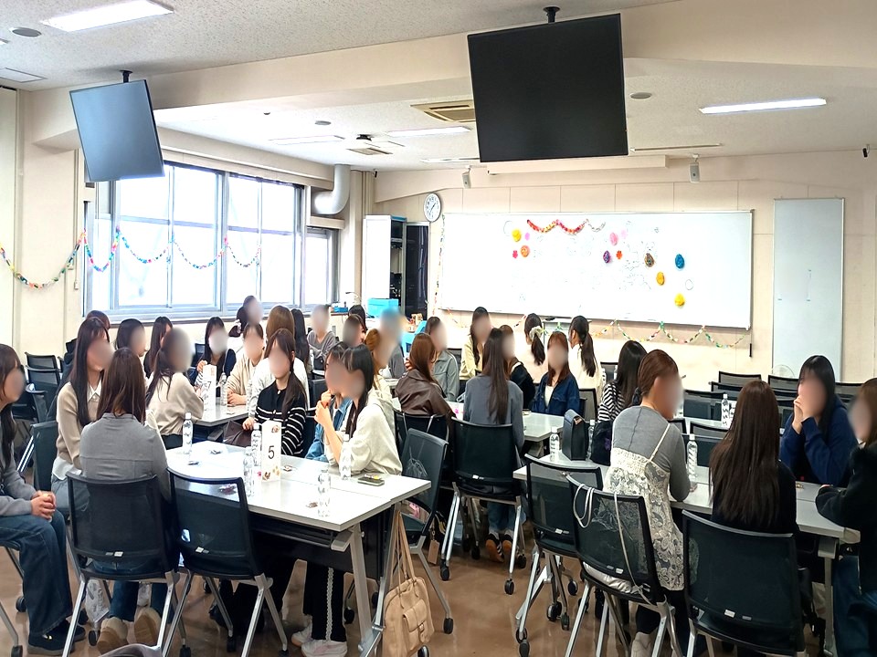 2年生有志が企画・運営する新入生歓迎交流会は、看護学部の恒例行事となっています。今年も入学後間もない新入生を迎え、2年生が各テーブルを回りながら、お菓子を囲んで和やかな雰囲気の中、楽しいひとときを過ごしました。
