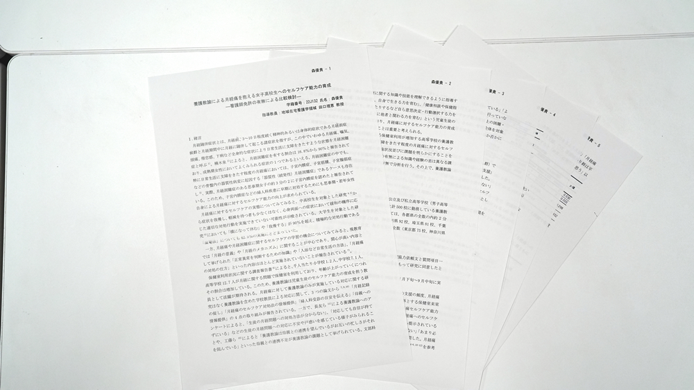 卒業論文を書く上で、支援の対象やどのような支援に焦点を当てるかといった詳細についてテーマを設定することが難しかったですが、大学で学びを深めていくうちに、月経で悩んでいる児童生徒の存在を知り、養護教諭による月経支援をテーマにしました。