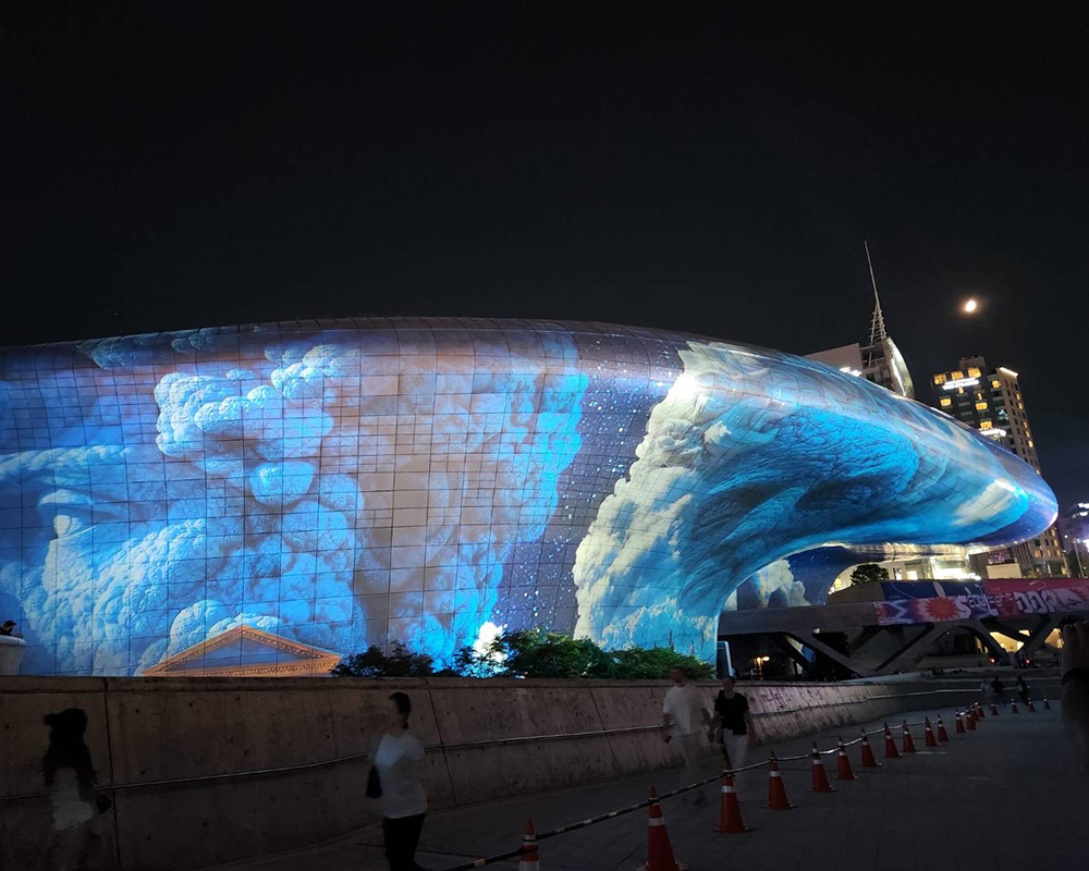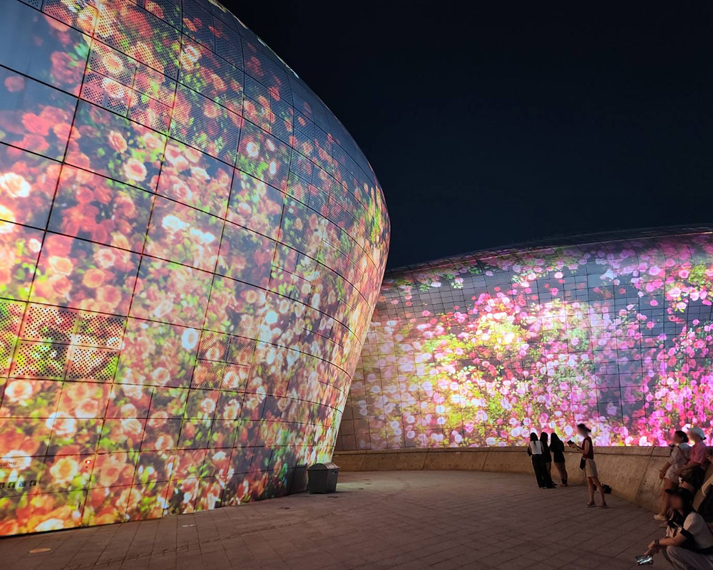 初日は韓国に到着後、東大門デザインプラザ(DDP)を訪れました。DDPはプリツカ-賞を受賞した建築家ザハ・ハディド(Zaha Hadid)によって設計されたソウルを代表する建築物の一つです。夜に訪れたため、DDPの外壁全体を使用したプロジェクションマッピングを鑑賞することができました。壮大なスケールと幻想的な演出が印象的でした。