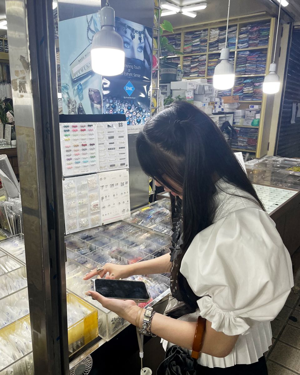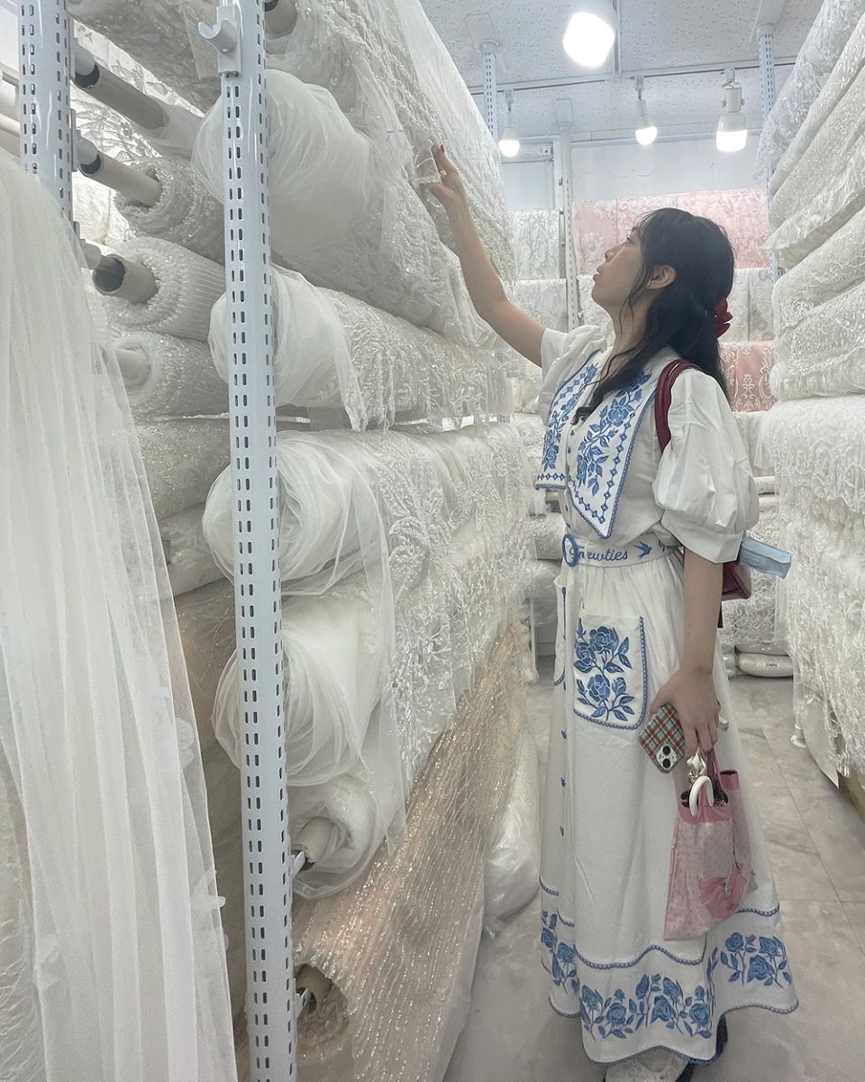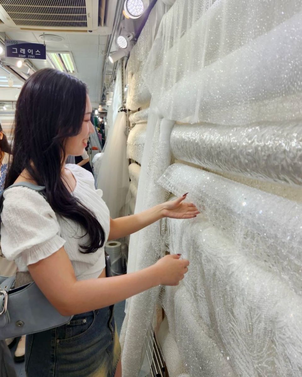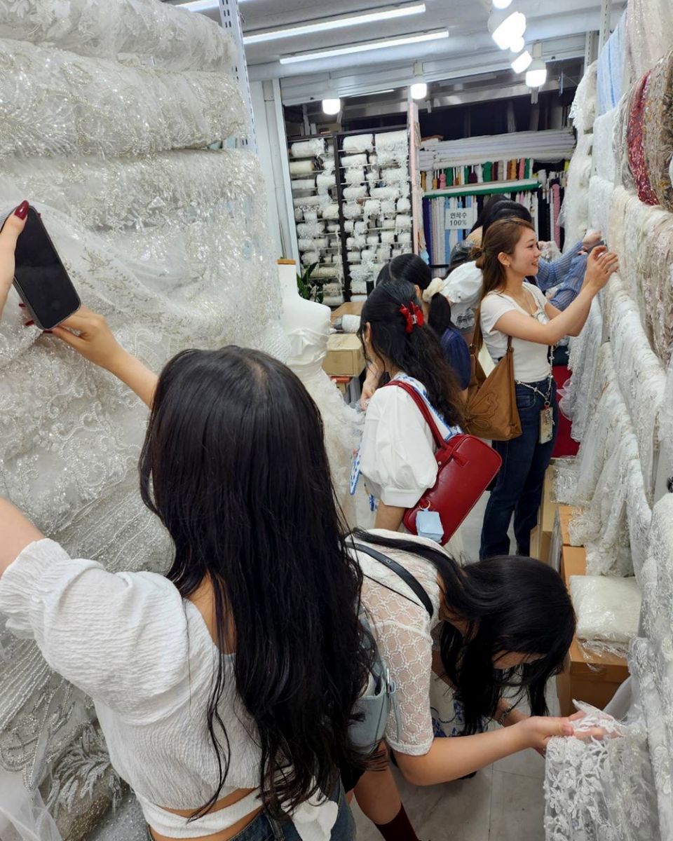 2日目には広蔵市場、3日目には東大門総合市場を見学しました。これらの市場では、韓国ならではの豪華なビーズ刺繍が施されたレースや、多彩な装飾品を実際に手に取って見ることができました。被服造形学研究室では、卒業研究のテーマとしてウエディングドレスの制作に取り組んでいます。学生たちは、各自のデザインに合う生地や装飾品を選ぶ貴重な機会となりました。