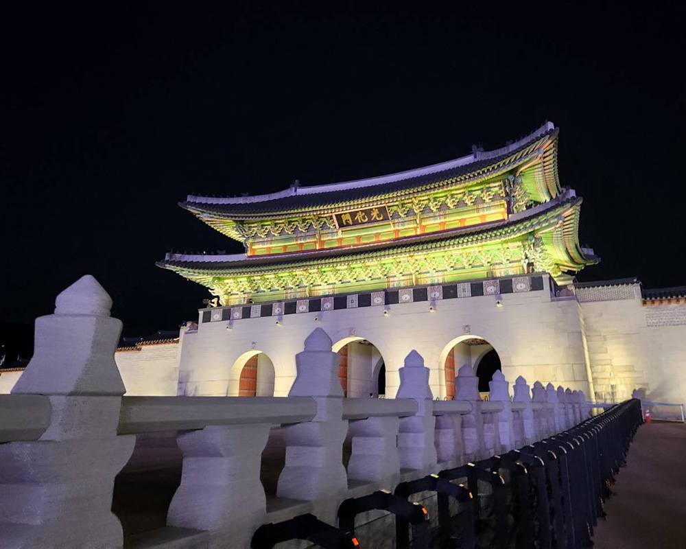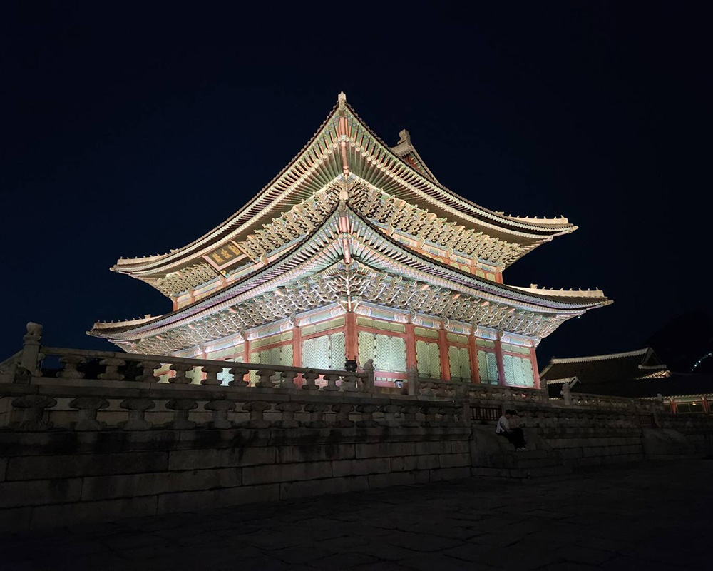 また、3日目の夜には景福宮を訪れ、夜間特別観覧を体験しました。景福宮は、朝鮮王朝時代に建てられた王宮の中でも最大の宮殿です。ライトアップされた宮殿は荘厳な雰囲気で、一層迫力のある光景でした。