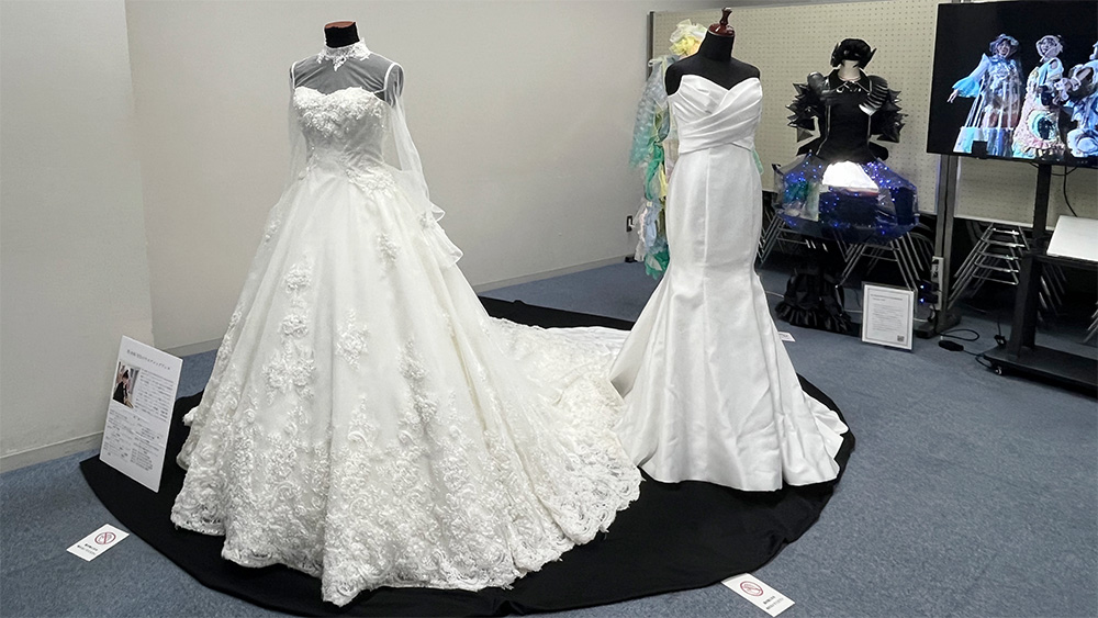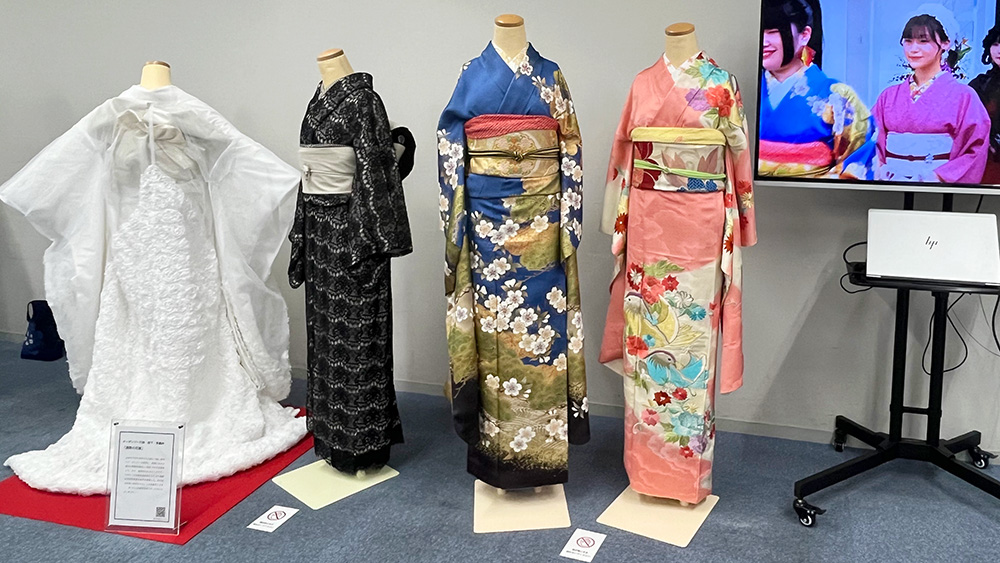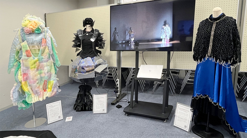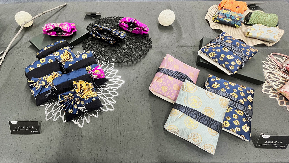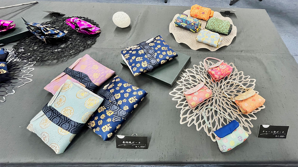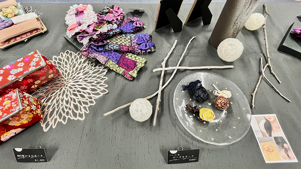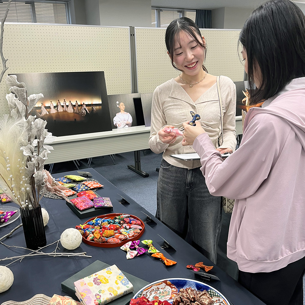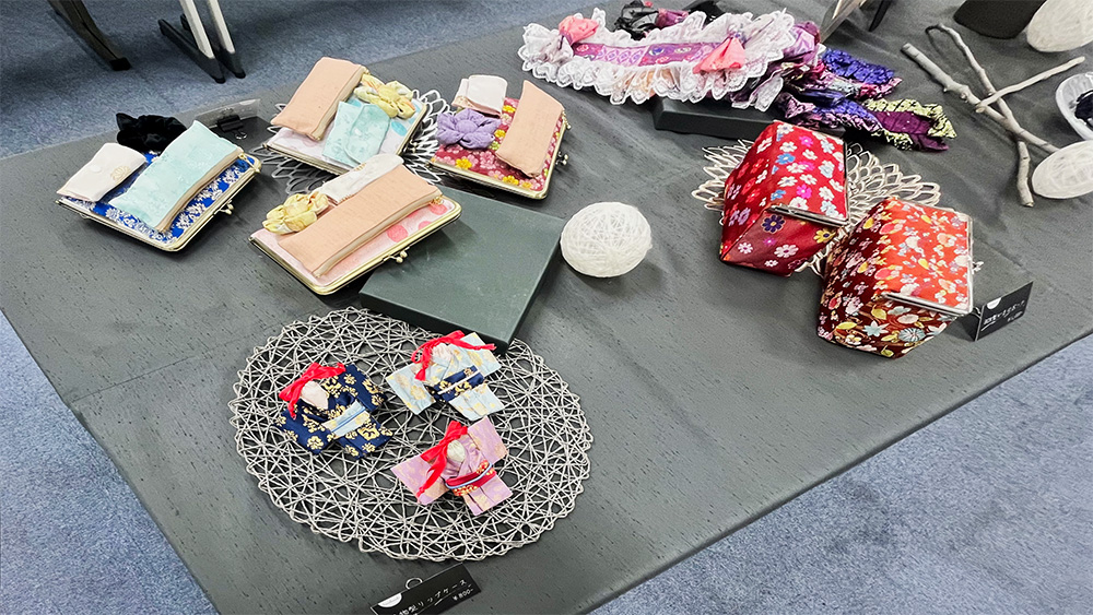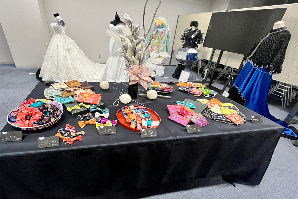 「SDGs体感マルシェ」と題し、京都の老舗織物企業から端切れをご提供いただき、デザインし制作した小物を販売しました。他にも、授業やゼミで制作した衣装などを展示しました。被服学科を身近に感じていただけたのではないでしょうか。