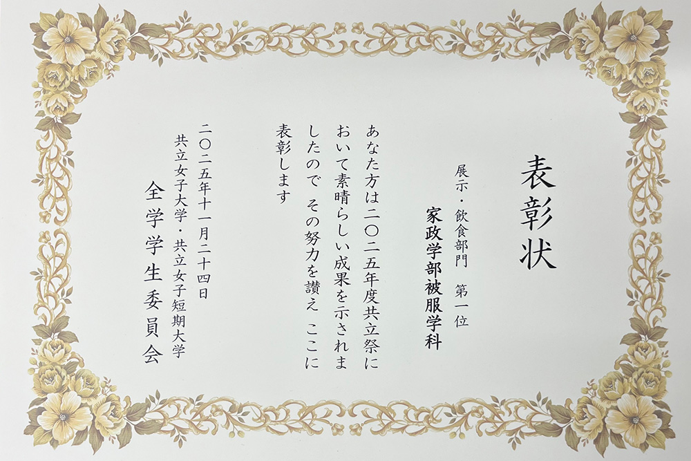 2025年10月18日(土)・19日(日)に開催された「共立祭2025」において、被服学科が出店した「SDGs体感マルシェ」が、学内の企画投票(展示・飲食部門)で1位を受賞しました。