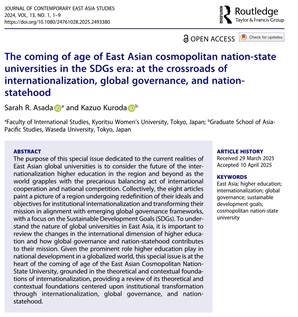国際学部のアサダ・サラ教授が国際学術誌 Journal of Contemporary East Asia Studies の最新特集号(Vol.13, Issue 1)で、黒田一雄教授(早稲田大学)、柳定賢講師(東京大学)とともに特別ゲストエディタ(Special Guest Editor)を務めました。