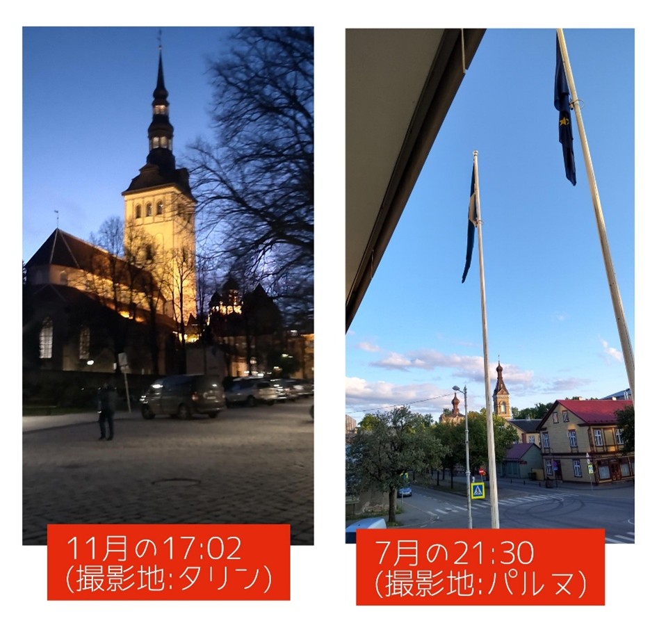最初に、気候についてお伝えしたい。2024年11月の東京では、この時期に19℃で例年より暖かいなどと言われていたが、エストニアでは3℃しかなかった。この時、手袋を持っていなかった為、あまりの寒さに手を動かすことが出来なかった。2025年6月に訪れた時は、朝は12℃程で昼でも15℃前後だったと思われるが、長袖必須で日本より寒かった。夏のエストニアは日本と違い、常に乾燥している。晴れていれば日差しが強いため、気温が20℃前後でも日向は暑い。冬は日が落ちるのが早く、夏は夜でも明るい。