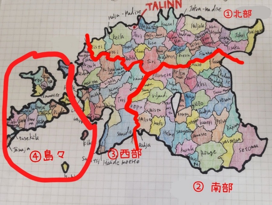 4つの区分について簡単に説明すると、北部は、ハンザ同盟で交易が盛んだったタリン(旧レヴァル)を中心に当時の流行が民族衣装にも影響されてい た。南部は北部と比べると伝統に保守的で昔ながらの伝統を大切に守っていたことが民族衣装にも表れている。西部では、その中でも北側と南側で違いがあり、北側は前述のように流行で、南部は伝統に保守的な傾向があった。また、エストニアの西部の地域の中では、この記事で今後紹介する予定のLihula(リフラ)のように、他には見られない植物の刺繍スカートやチェック柄のスカートも着用されている所もあった。