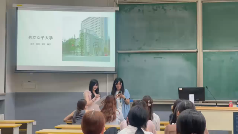 まず、日中の学生は2つのグループに分かれて、キャンパスを見学しました。現地で長期留学の共立の学生と共立に留学した経験のある人民大の学生を交え、活発な交流が行われました。教室では、2年生の天野舞子さんと3年生の鈴木宏枝さんがパワーポイントで共立紹介を行いました。