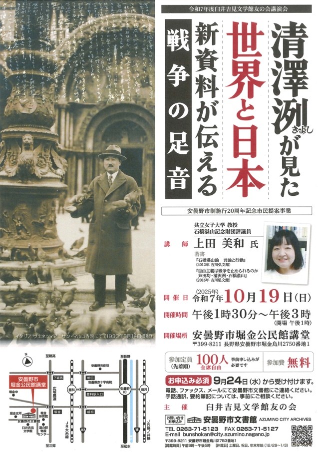 さる10月19日(土)、国際学部・上田美和教授(日本近現代史・思想史)が長野県安曇野市堀金公民館講堂で「清澤洌が見た世界と日本 ―新資料が伝える戦争の足音―」と題する研究講演を行いました。