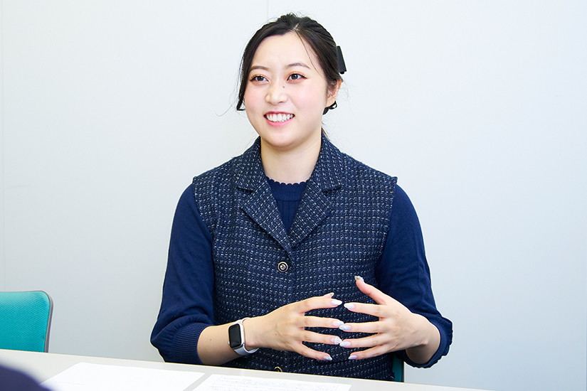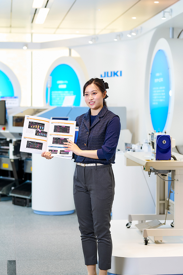 私が勤めるJUKI株式会社は、世界シェアトップの工業用ミシンメーカーです。世界の隅々まで「衣」を届け、世界中の人々の生活を豊かにしたいという思いで仕事に取り組んでいます。メインの業務は、JUKIのミシンを使う縫製工場の生産性向上に向けたコンサルティング活動です。独自の調査方法で工場の現状を把握し、そのデータをもとに改善策を立案して、取引先のトップを相手にプレゼンテーションを行っています。また、新たに工場を立ち上げるためのプラント設計も業務の一つです。ある国の大統領夫人から「自国に縫製工場をつくりたいので手伝ってほしい」と依頼を受けたこともあります。その国は、縫製工場が一つもないような国でした。その際は、工場設立に向けて、生産アイテムの選定や使用機器、必要人員、所要時間などの生産工程を検討して提案し、採択されました。「衣」で世界中の人々の生活を豊かにする、という目標に一歩近づけたことが嬉しかったです。最近では、新商品の企画書作成や販売価格設定なども担当しています。自身が企画した新商品が販売開始された際は、誰かの役に立てていることを実感でき、大きな達成感がありました。