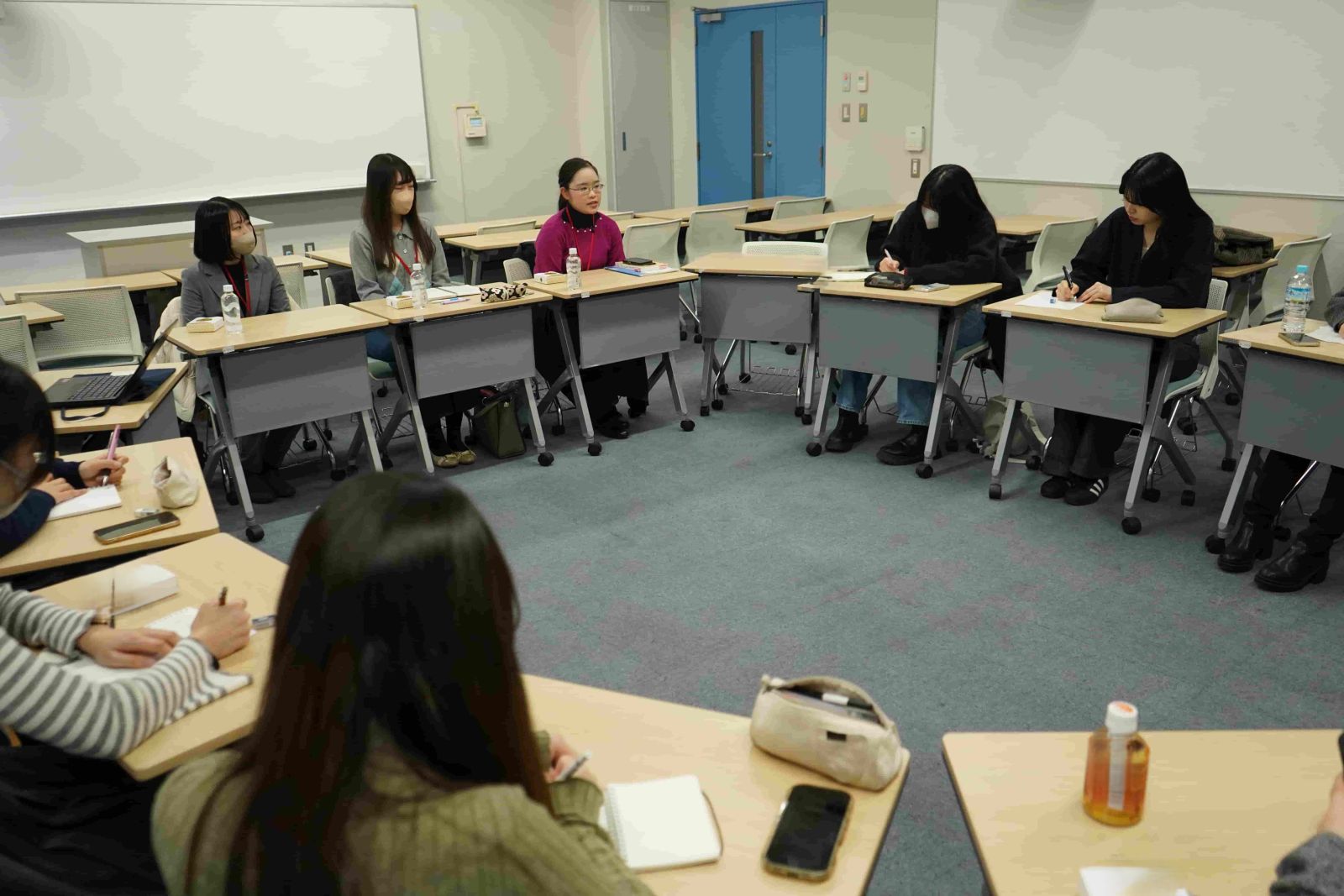 卒業生3名をお招きし、前半は教員のやりがいや仕事内容、当時の就職活動の動きについてお話いただき、後半は在学生からの質問にお答えいただきました。卒業生の話を熱心にメモしながら質問する姿が見られました。