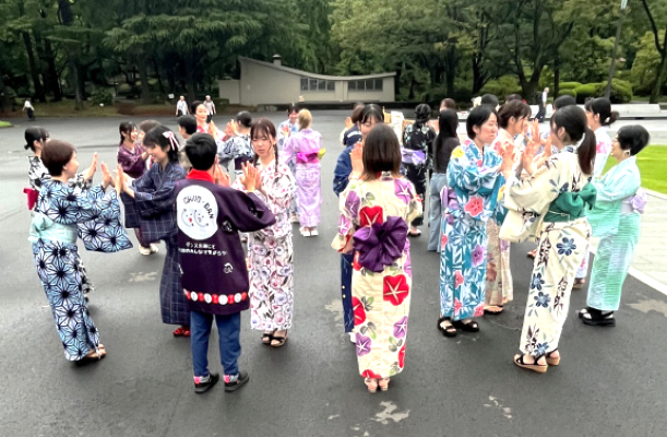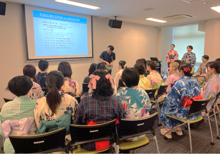 日比谷公園の歴史や浴衣についての説明、エスコートダンス協会によるちよダンを参加者で練習しました。会の後半には雨も上がり、屋外に出て関係者のみで打ち水を行い、ちよダンを踊り、和やかに時間を過ごしました。千代田区で新たな連携活動の輪が広がりました。
