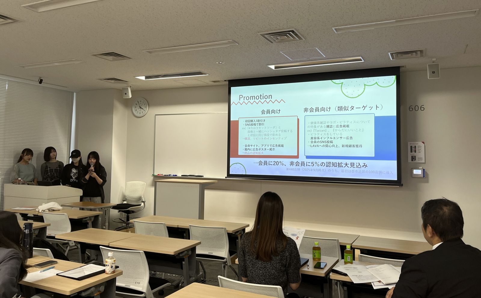 横浜中華街や小売店でのフィールド調査、ならびにこれまでのレクチャー内容を踏まえ考案した商品・サービスについて各チームがSWOT分析や4P分析を用いて発表しました。
