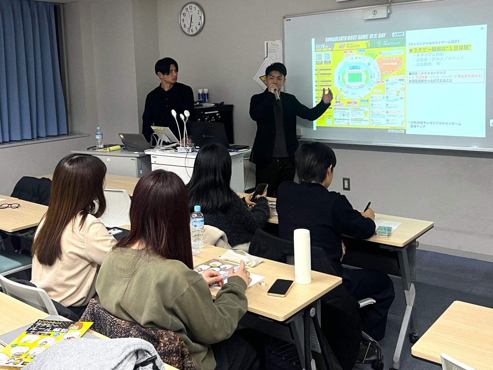 本プロジェクトは、プロラグビーチーム「東京サントリーサンゴリアス」との連携により、チームの課題である「若年層の顧客拡大」を目指し、学生の視点で若年層(特に女性や学生)がラグビー観戦に来たくなる"推せる企画"をチームメンバーと一緒に考える取り組みです。