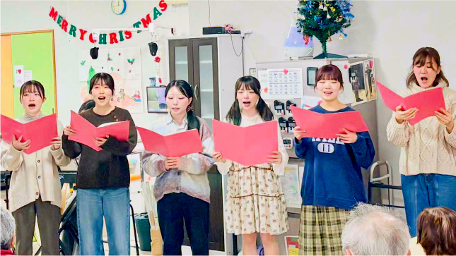 脳疾患を抱える高齢者に「癒やし」を届ける実践的な活動です。学生が考案・調理した手作りデザートと、心安らぐ音楽の生演奏を提供。単なる慰問に終わらず、「脳の血流改善」「ストレス値の低下」などの効果を科学的に検証し、学生のモチベーションに繋げています。日々演奏練習で心を一つにしながら、学生主体で企画・運営を行うことで、社会貢献と共に本学が目指す「共立リーダーシップ」が「自立×友愛」に基づいて磨き上げられた取組みとなっています。