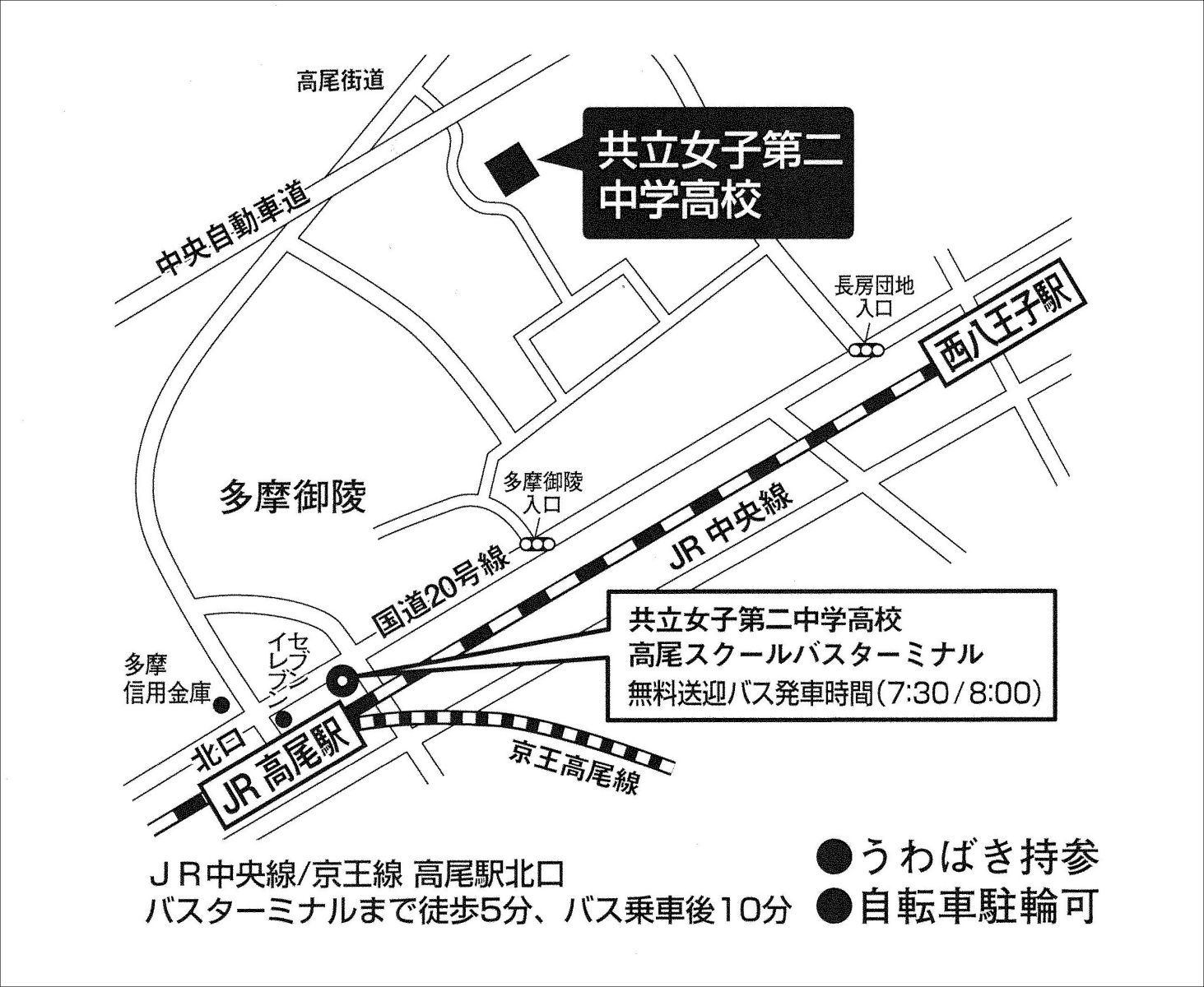本校では、JR・京王線 高尾駅北口より徒歩5分の学園バスターミナルより、学校までスクールバスを運行しております。