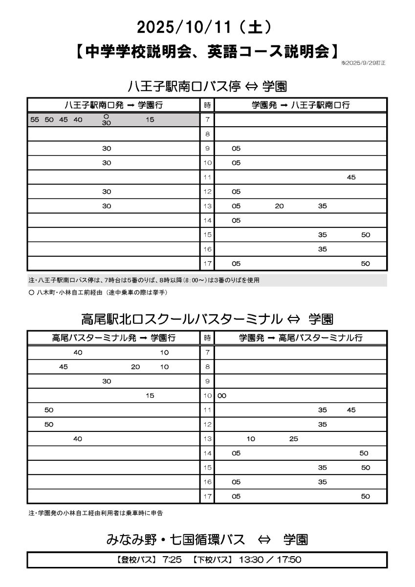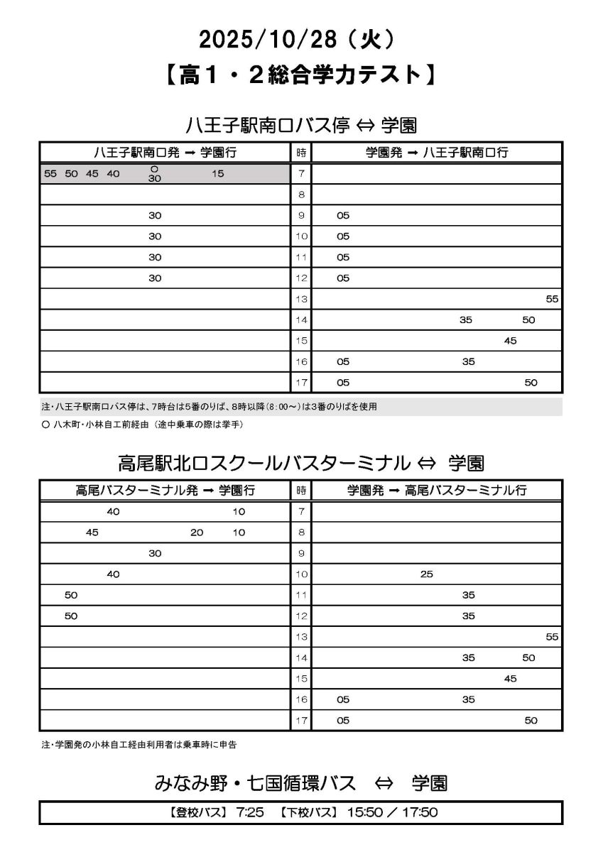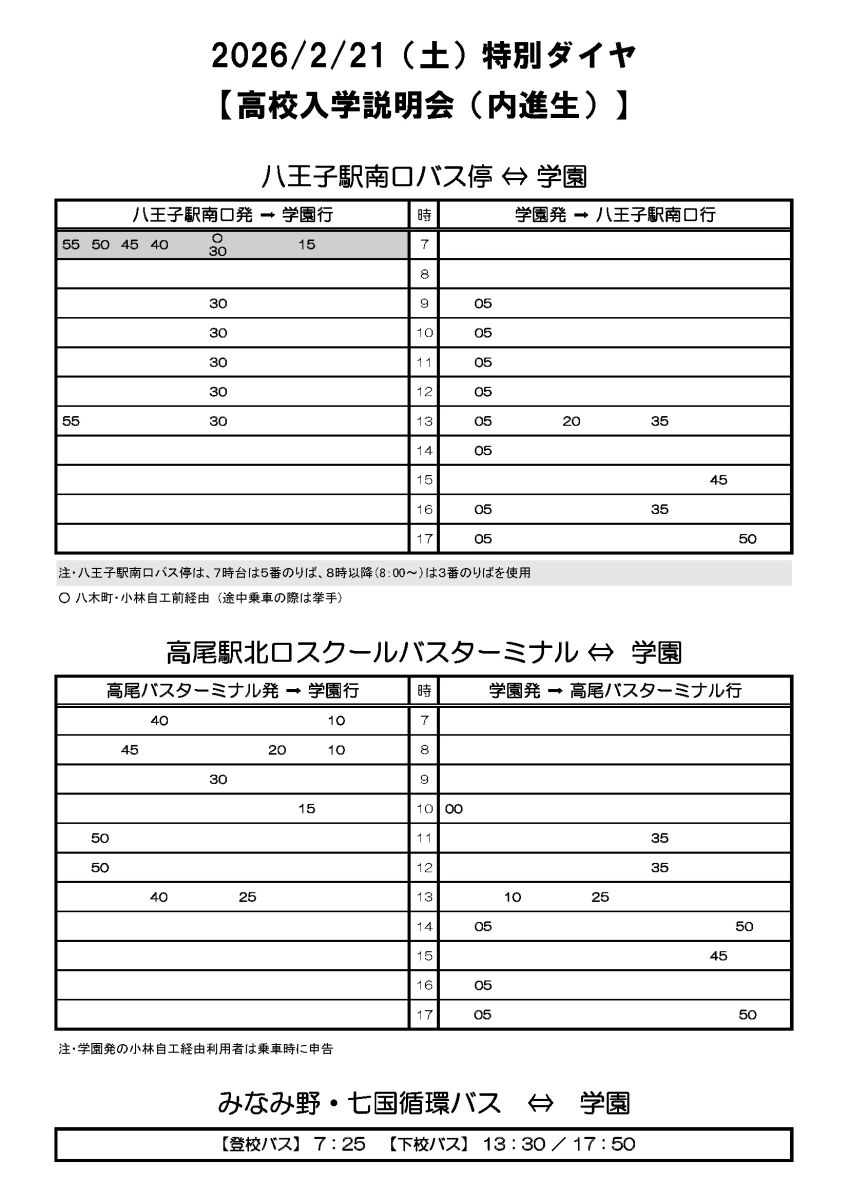 ※ 下記時刻表は一般の方向けのため、生徒・職員の専用バス、学校都合による当日変更(追加)便など、時刻表以外に運行される場合がありますのでご承知おきください。
