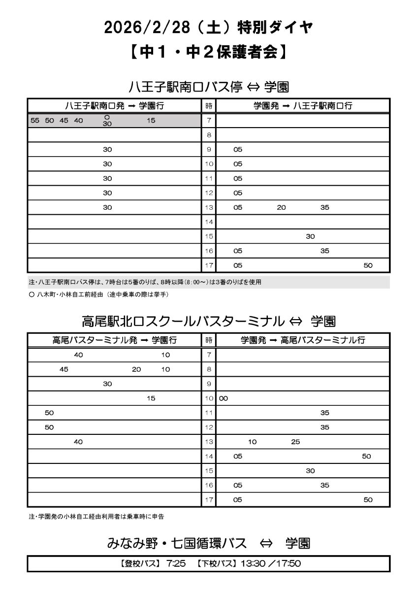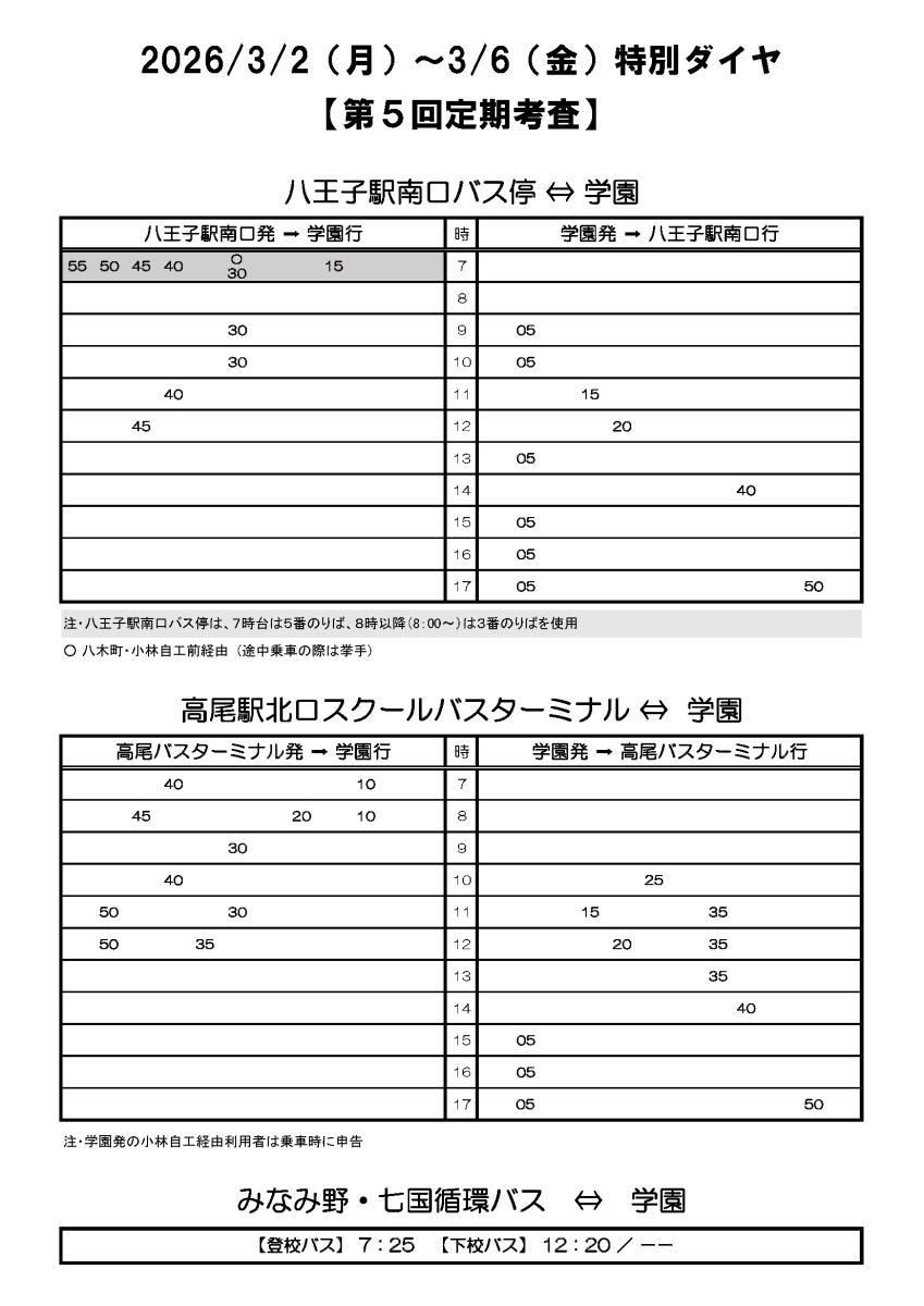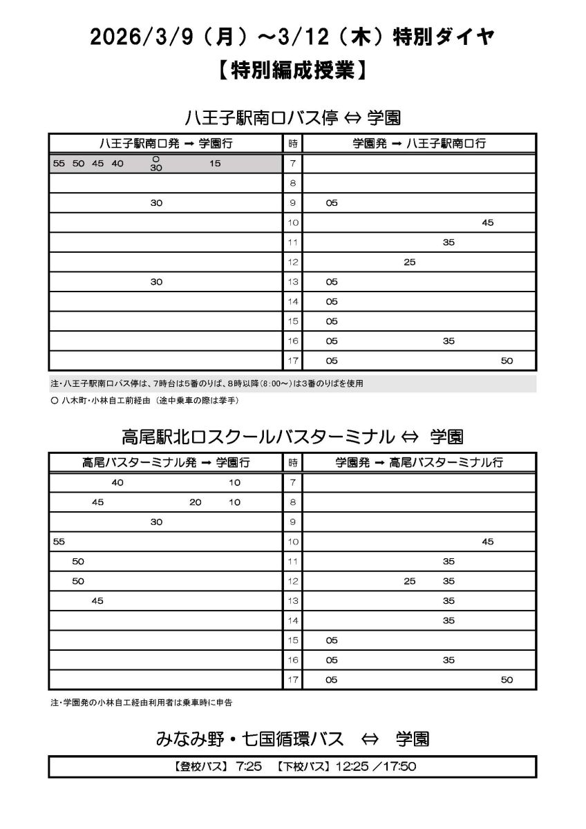 3,行事・定期考査・短縮授業など通常と異なる時程の日は特別ダイヤとなります。下記「特別ダイヤ運行日」を必ずご確認ください。