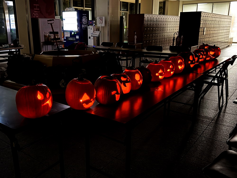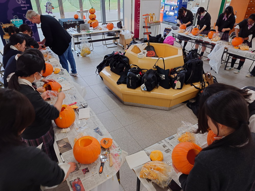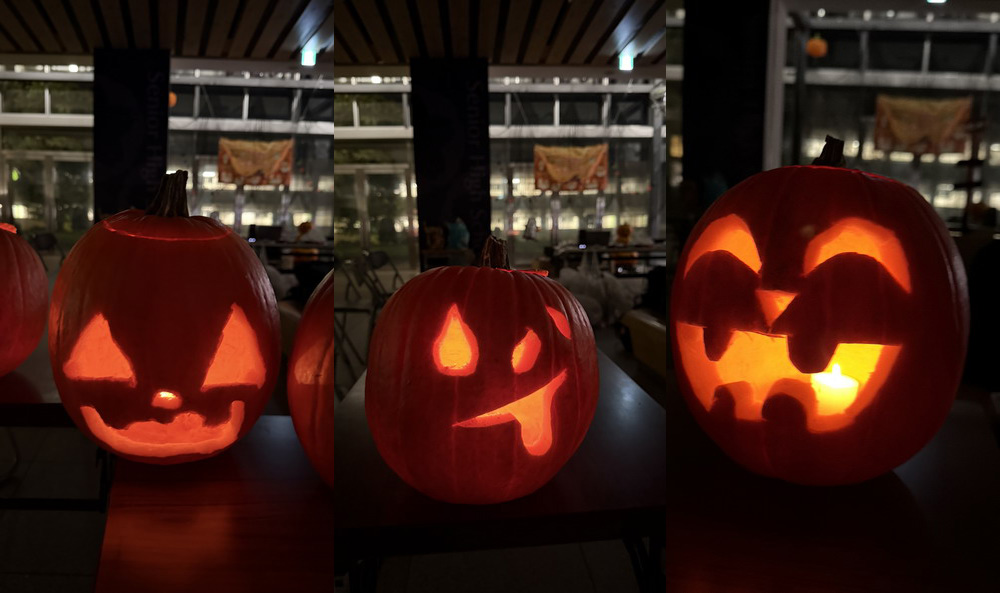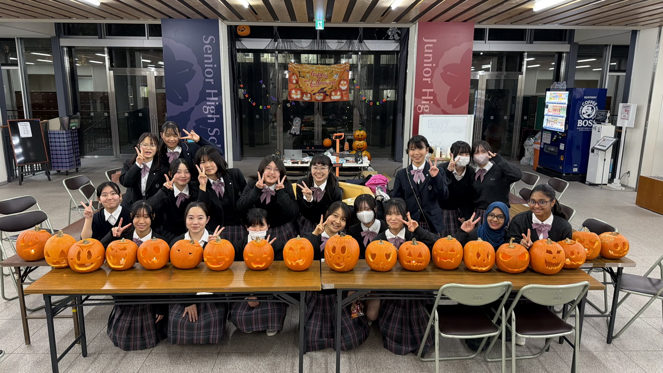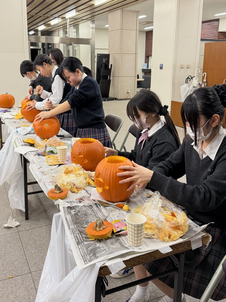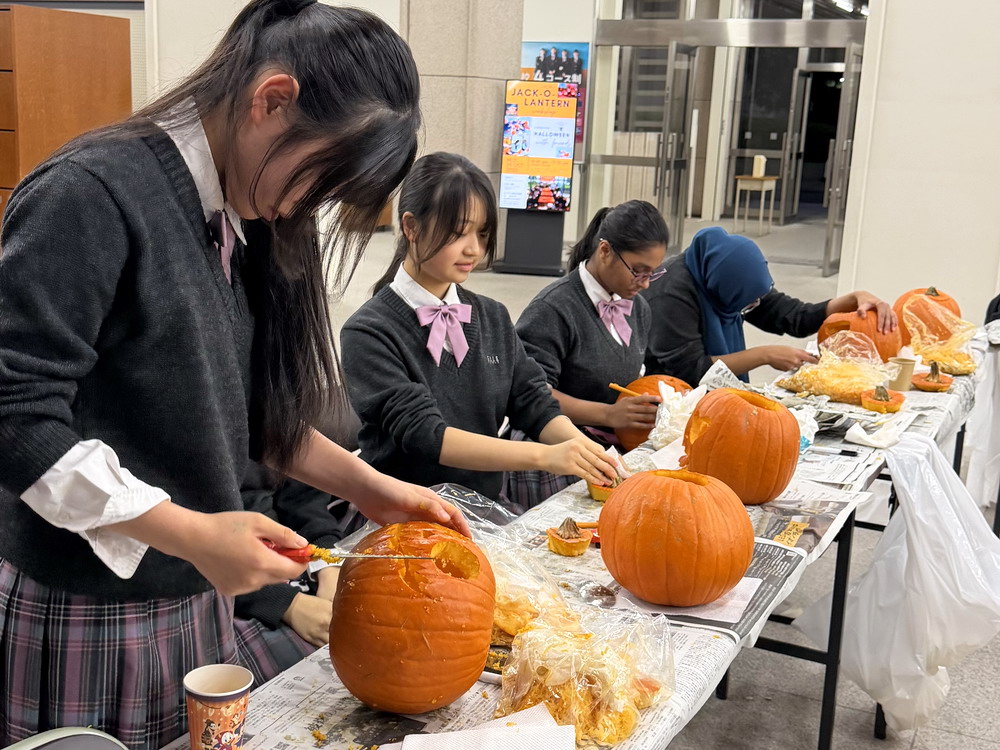 昨日の放課後、パンプキン・カービング(かぼちゃのランタン作り)のワークショップを実施しました。 生徒たちは道具の使い方に気を配りながら、友達と協力してかぼちゃの中をくり抜き、思い思いの顔を彫り込んでいきます。 ESSのメンバーが設営や片付け、会場の整理を積極的に手伝ってくれたおかげで、終始スムーズに進行できました。 完成したランタンにはキャンドルが灯され、個性あふれるデザインが暗闇に映え、とても幻想的な雰囲気に包まれました。
