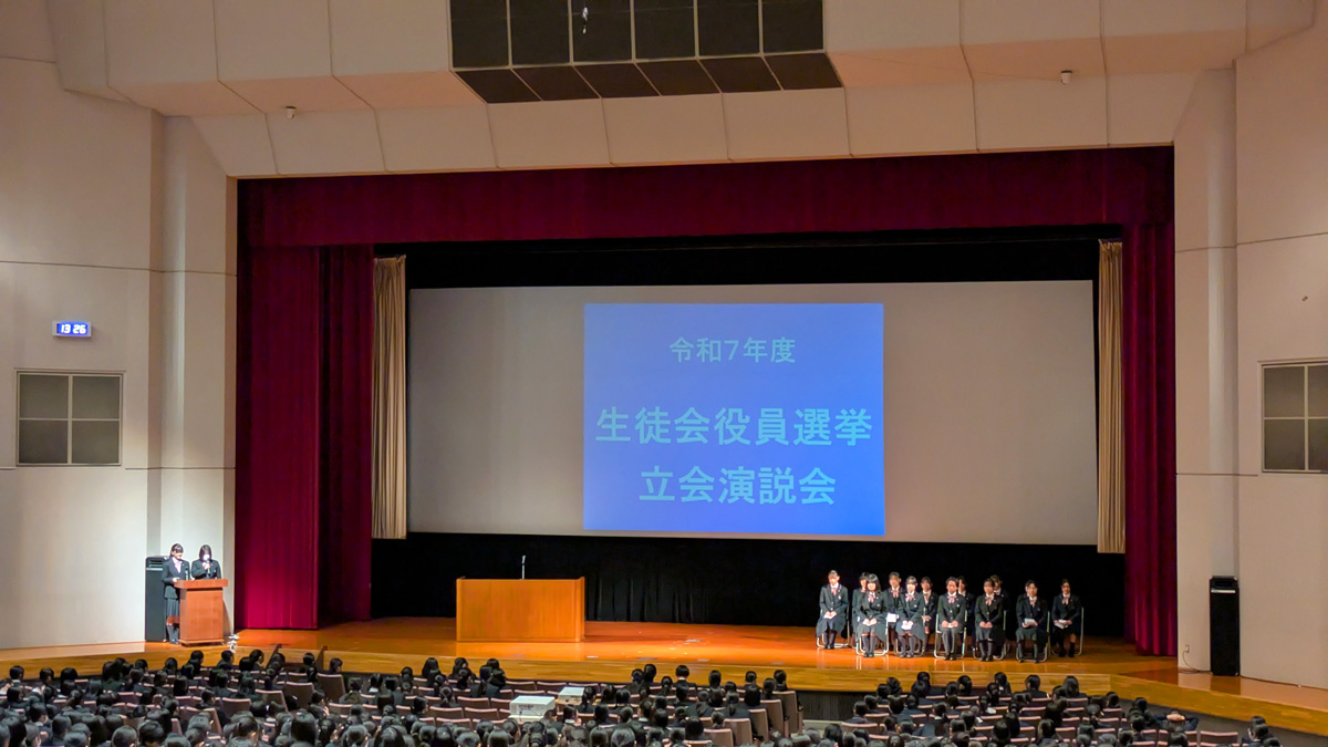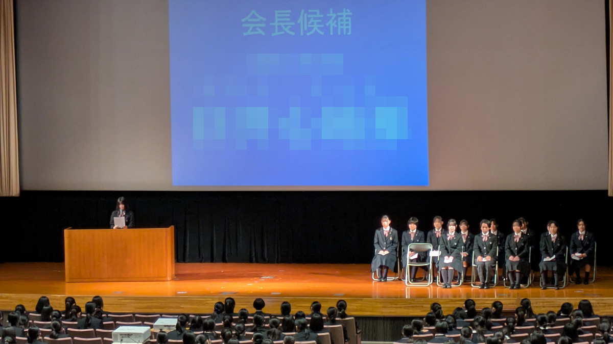 総会終了後、次に生徒会役員選挙の立会演説会が行われ、立候補者たちが生徒たちに向けて公約や意欲を訴えました。