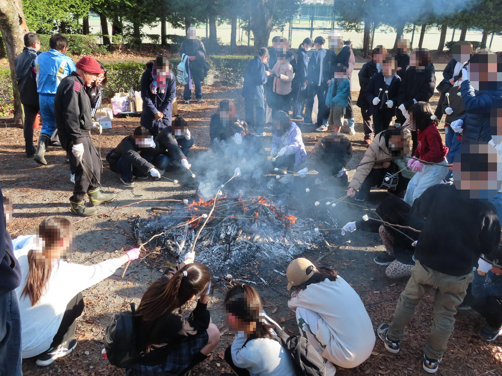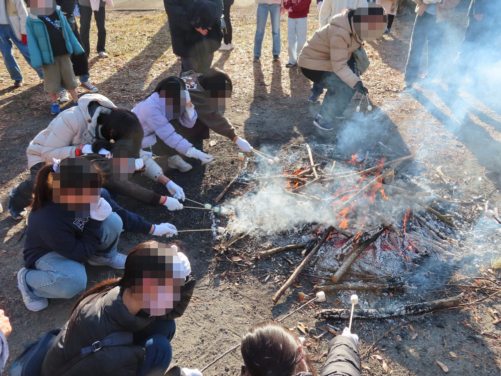 芋が焼けるのを待つ間は、子どもたちも竹串(や木の枝)を使ってマシュマロを焼き、焚き火の熱さを体感。