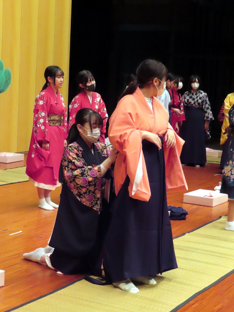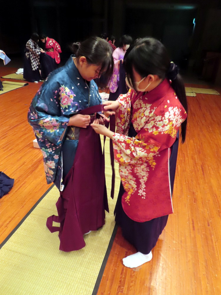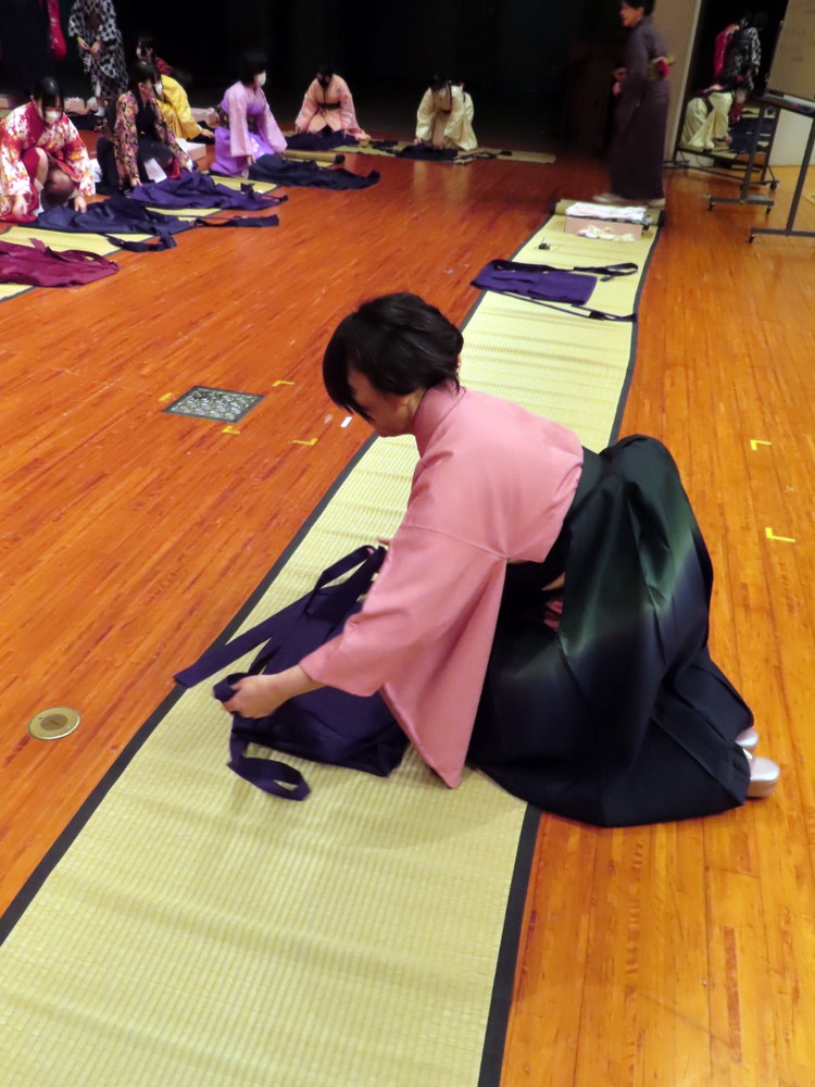 一人ひとり、着付けの初歩から、袴のたたみ方まで丁寧に教えていただきました。