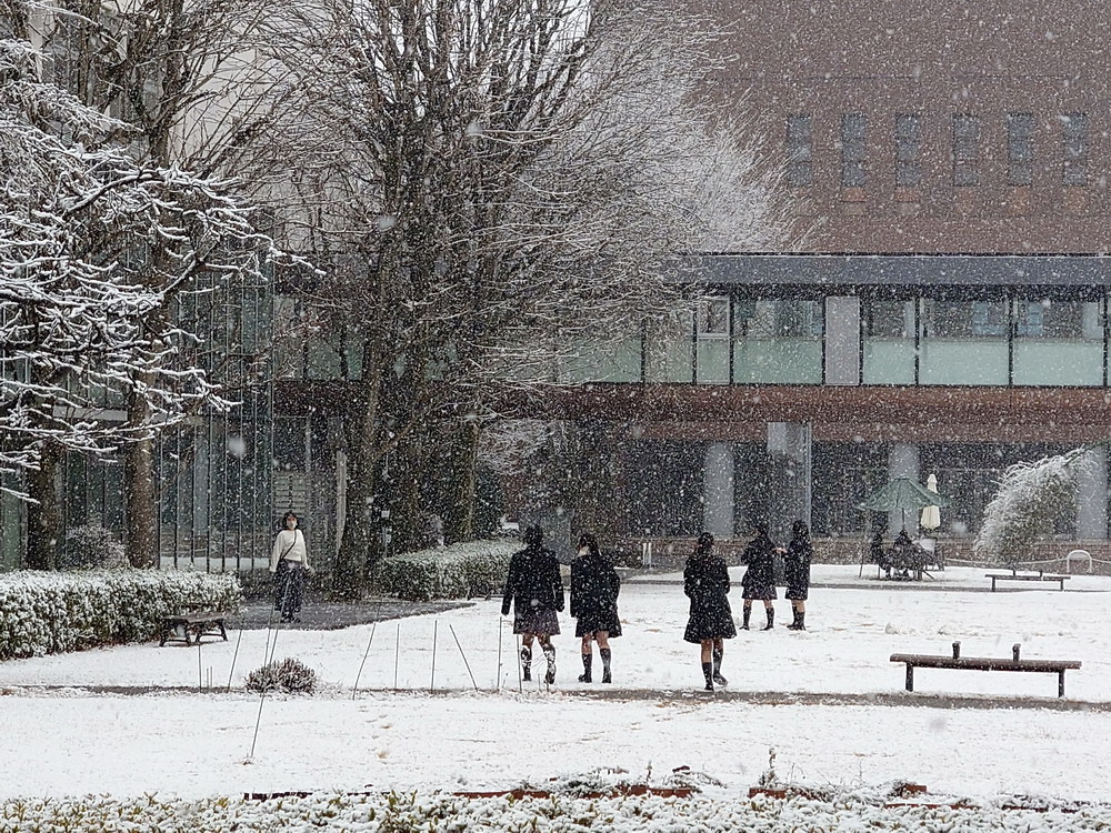 久々の雪に興奮して(?)中庭で遊ぶ生徒もいましたが、多くの生徒が下校した午後3時ごろにはほぼ止んで、道路の雪も溶けはじめました。
