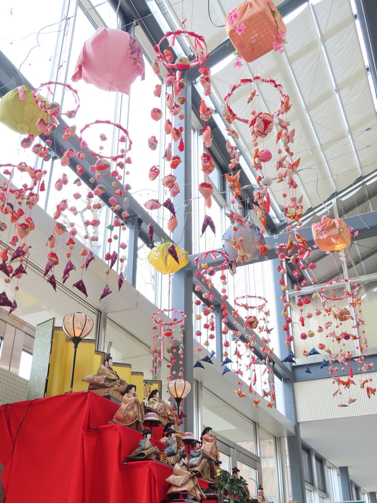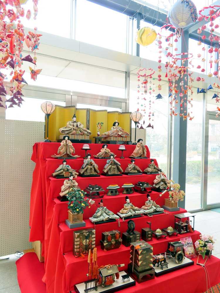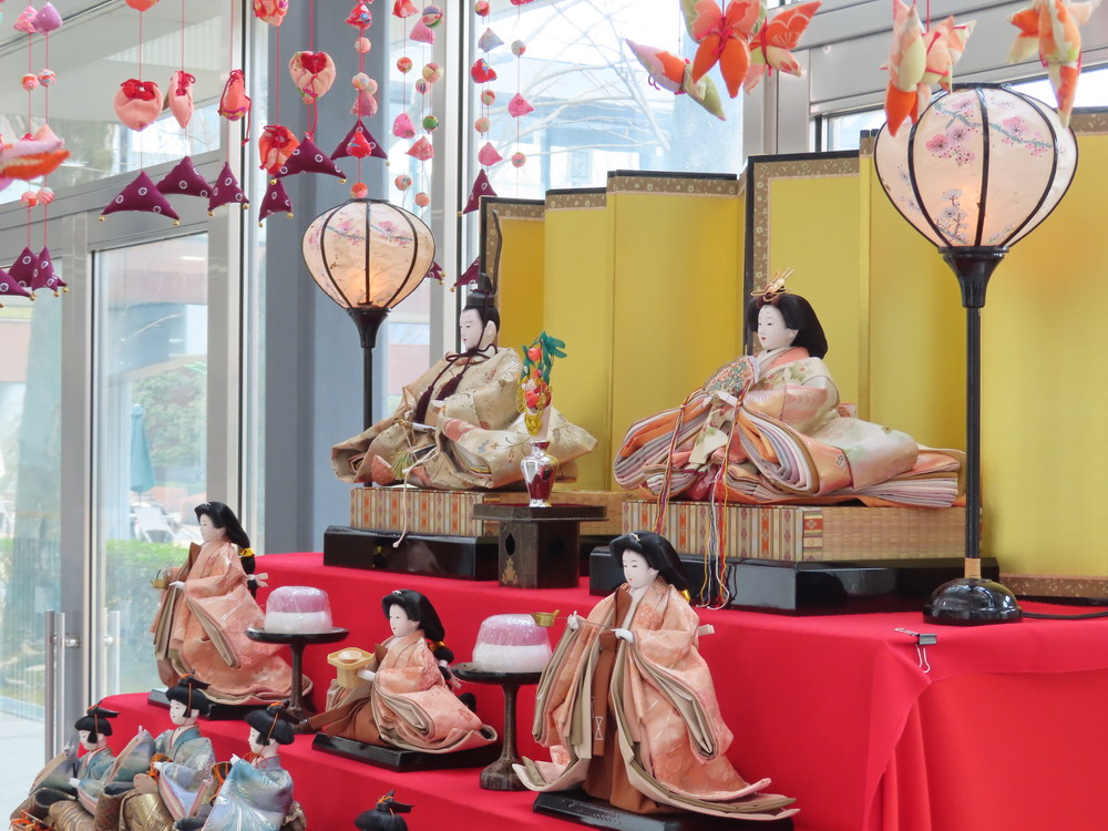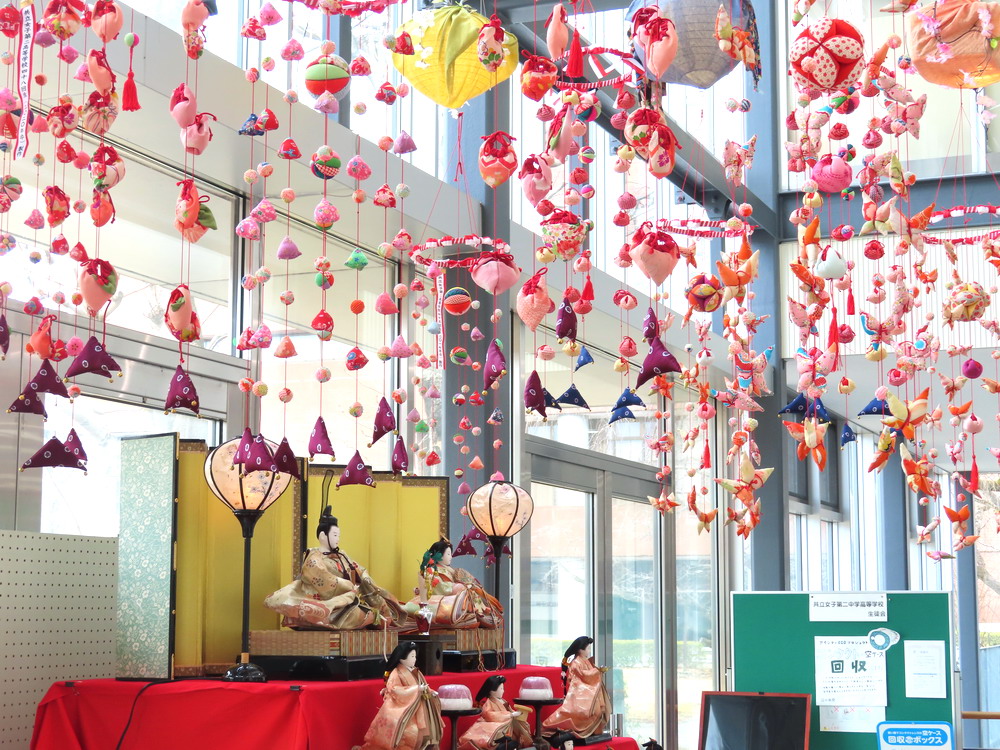 本日3月3日は桃の節句、ひな祭りです。 今年もちょうど定期考査が始まっており賑やかにお祝いはできませんが、それでもひな人形がテスト中の生徒たちを癒して元気づけてくれます。 写真は玄関ホールに飾られたひな人形、つるし雛は卒業生たちが作ってくれた置き土産です。