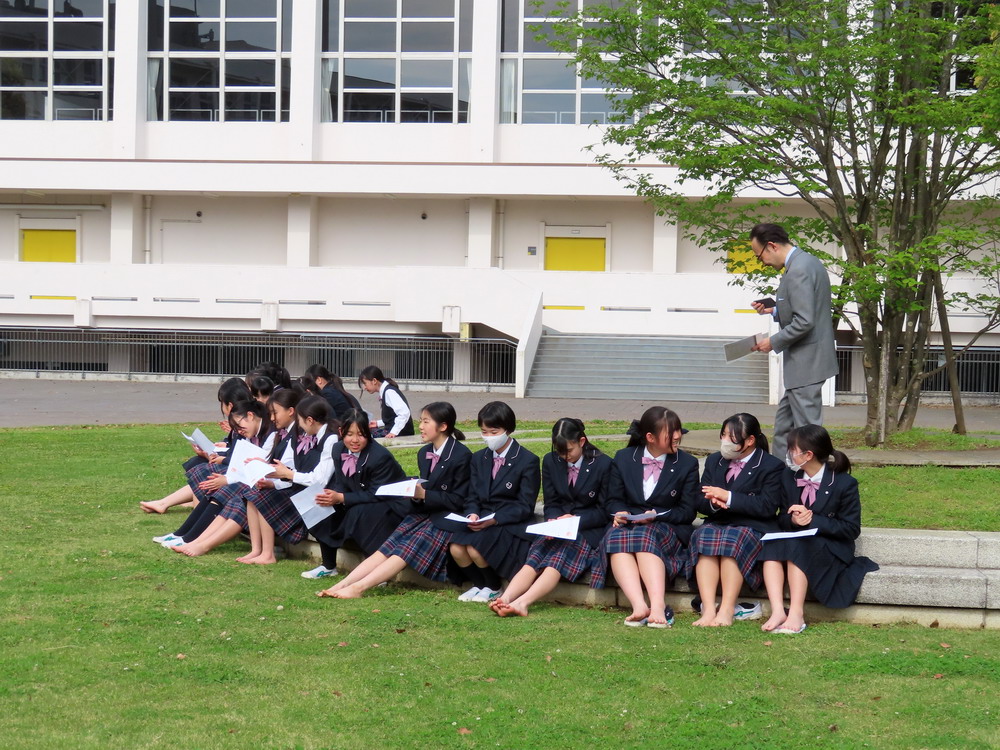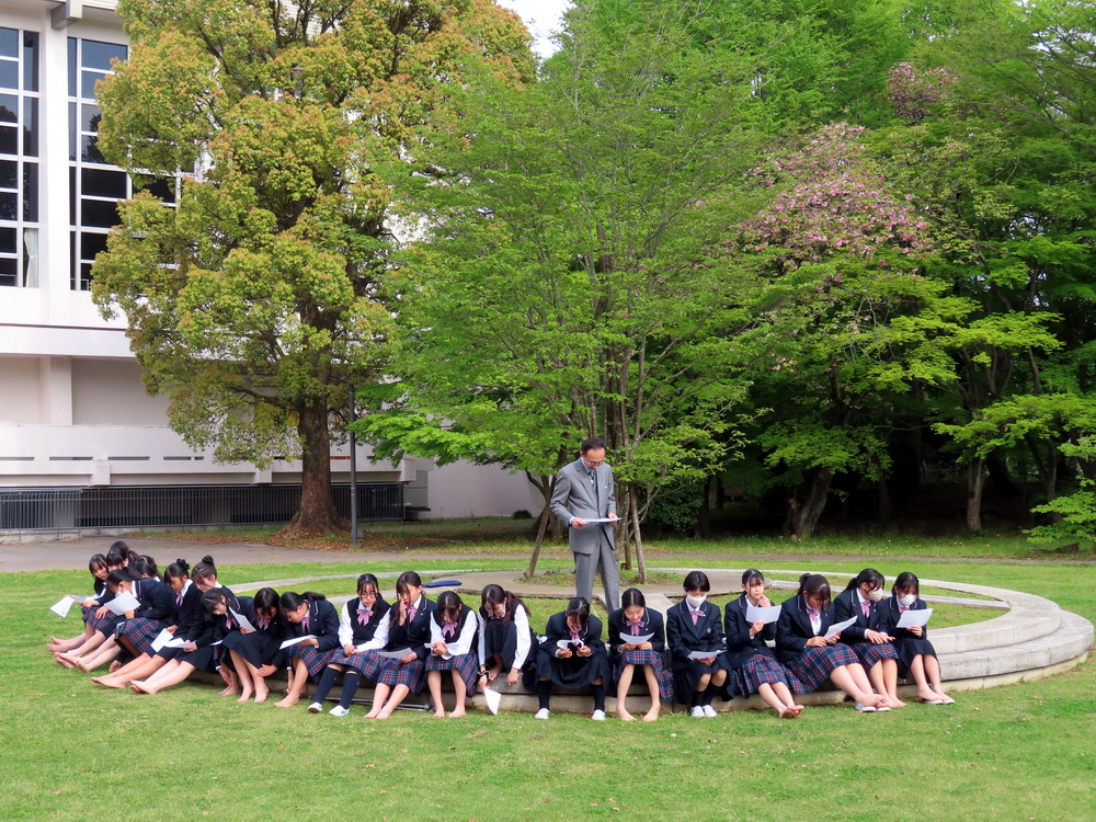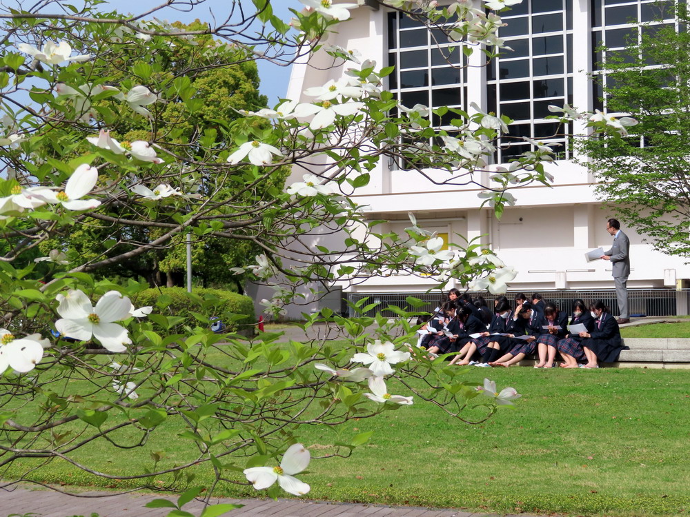 緑が鮮やかになってきたキャンパスの前庭では、昼下がりに生徒たちが出てきて授業を受けていました。
