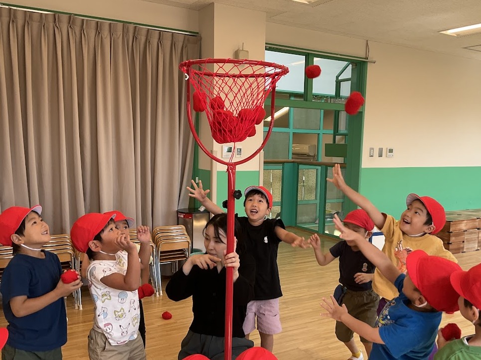 おひさま組(年中組)は、玉入れをしています。玉を上に投げるのが最初は難しかったけれど、入ると嬉しくて、何度も何度もやってみる姿がとても楽しそうです。