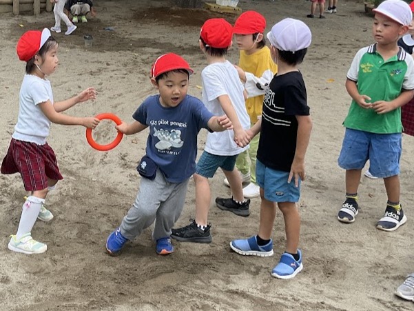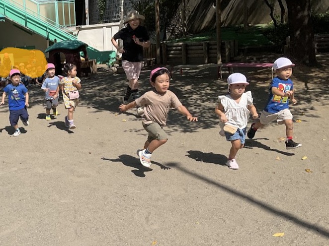 もり組(年少組)は、先生やお友達と「よーい、どん」の掛け声とともに、かけっこを楽しんでいます。「足が速くなった!」「もう一回やりたい!」と、喜ぶ声も聞こえてきます。