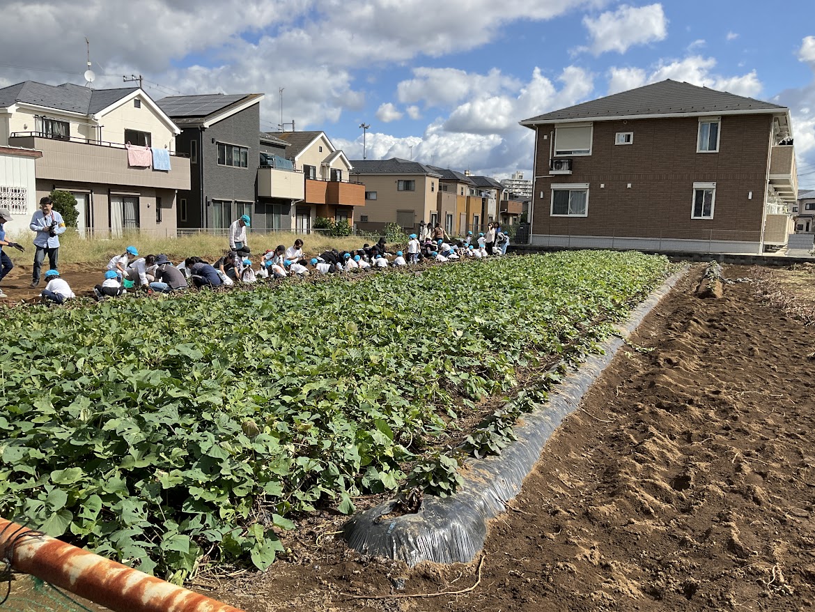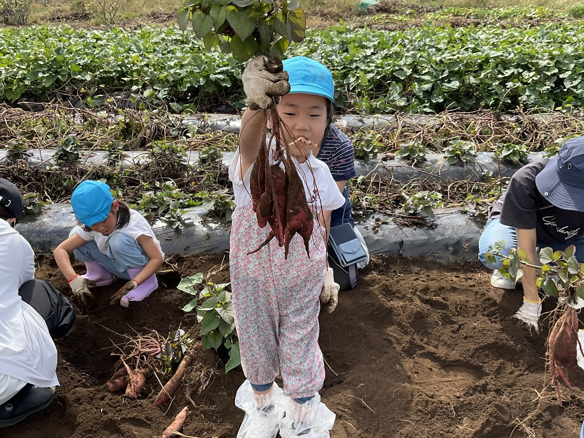 畑の土はふかふかで、「あったかーい」「気持ちいい~」と、最初は和やかに掘り始めたお子さん達。土の中からお芋の頭が見えると、「あった!」「もっと掘らなきゃ!」と、汗だくになって掘り進めて、鈴なりのお芋が出てくると、大喜びでお友達やお家の方や先生に報告する姿があちらこちらで見られました。お芋を傷つける可能性があるのでシャベルは使わずに、手で一生懸命掘りました。「まだまだありそう!」と次から次へとお芋を掘るのは、まるで宝物を探しているかのようで、ワクワクしましたね。
