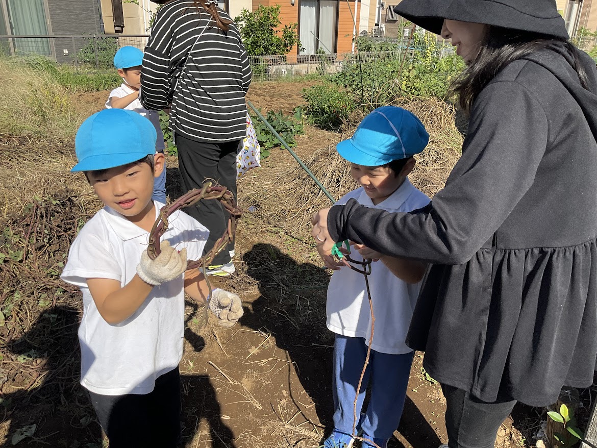 午後は、お芋のつるでリース作りをしました。好きな長さと太さのものを自分で選び、親子でくるくると巻いて適当な大きさにし、固定する為にリボンで結んだり新しいつるで巻いたりしました。お友達同士で見せ合いながら、それぞれのリースが出来上がっていました。このリースはしっかり乾燥をさせてからクリスマスリース作りを行う予定です。どんな飾り付けにしようかと、今からとても楽しみにしている様子がありました。
