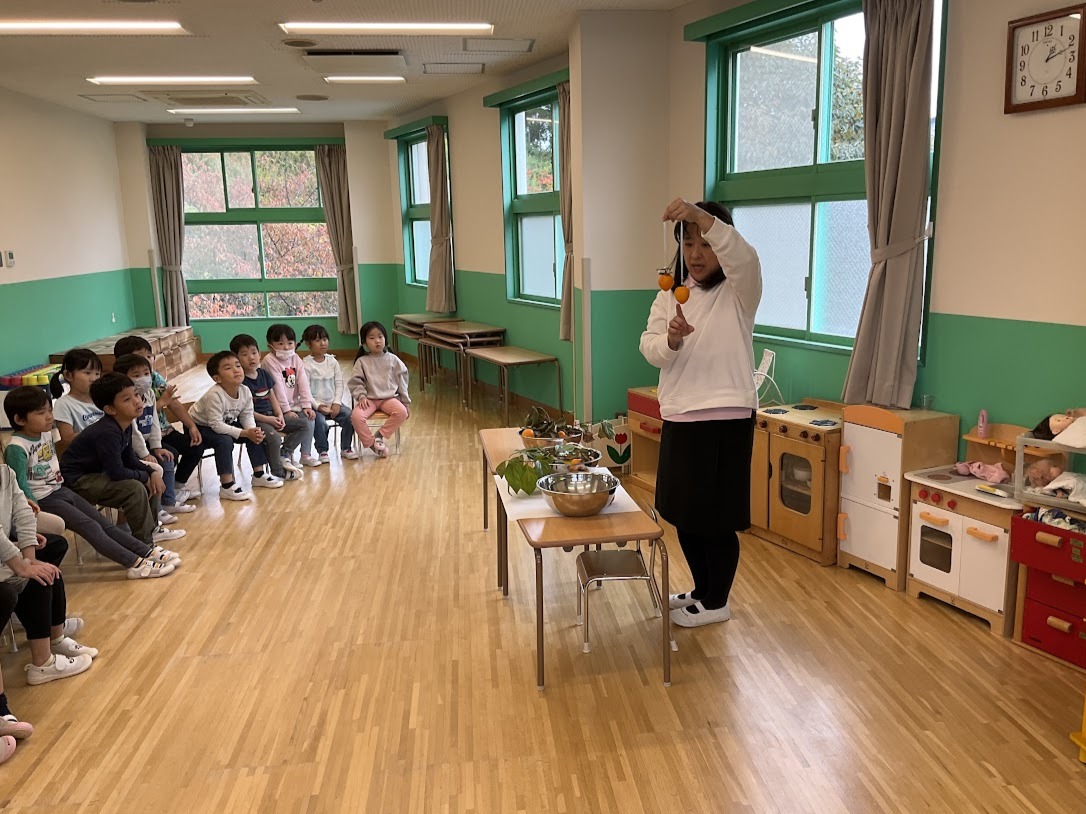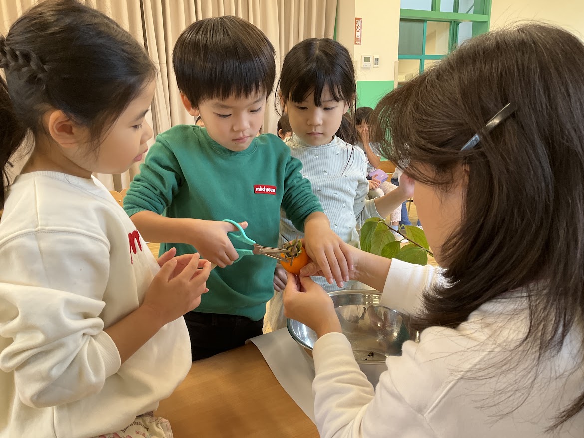 幼稚園の柿は渋柿なので、そのままでは食べられません。収穫したその日のうちに、こばと組はお遊戯室で園長先生から干し柿の作り方を教えていただき、へたの葉を切り落とすお手伝いをしました。そうすると、へたのつけ根の部分までしっかり太陽の光が当たるので、おいしい干し柿になることを知りました。1人ずつ丁寧にはさみを持ち、少し緊張しながらしっかりと葉を切りました。