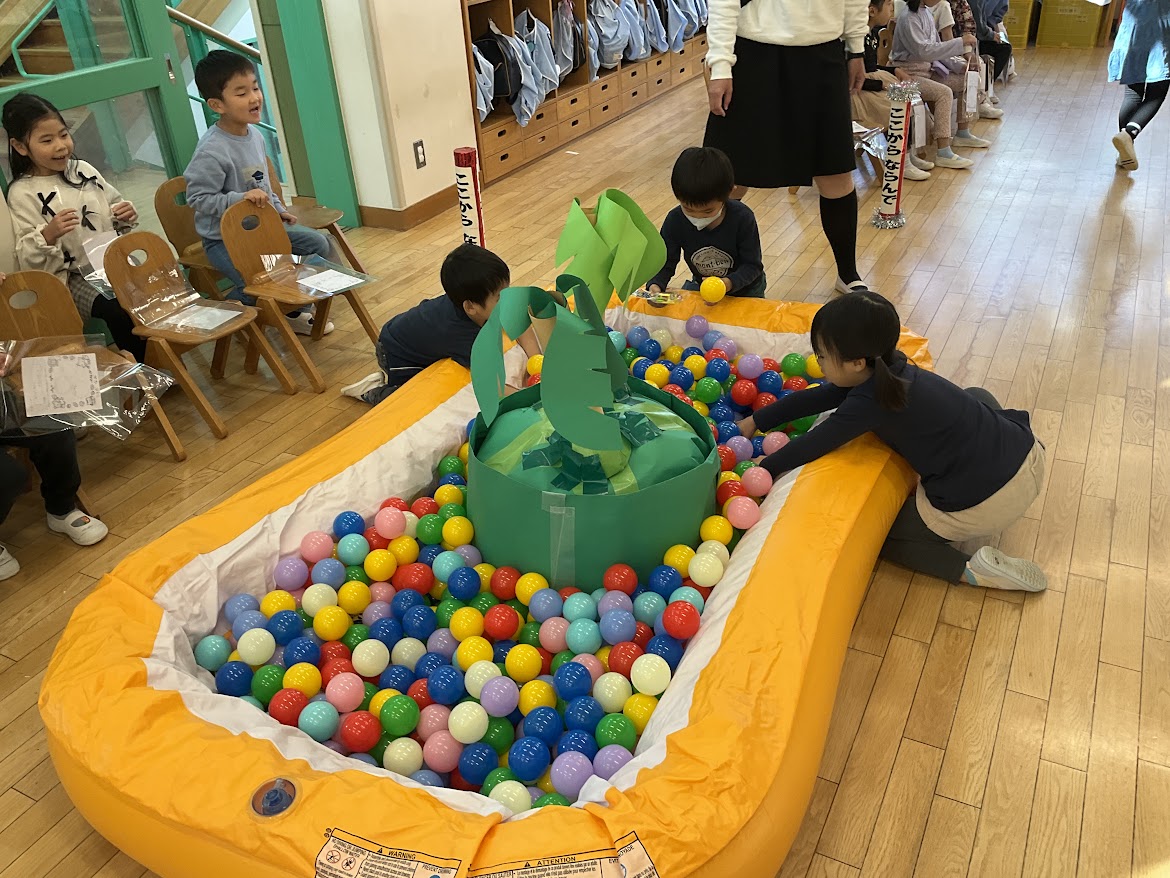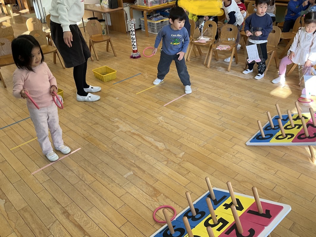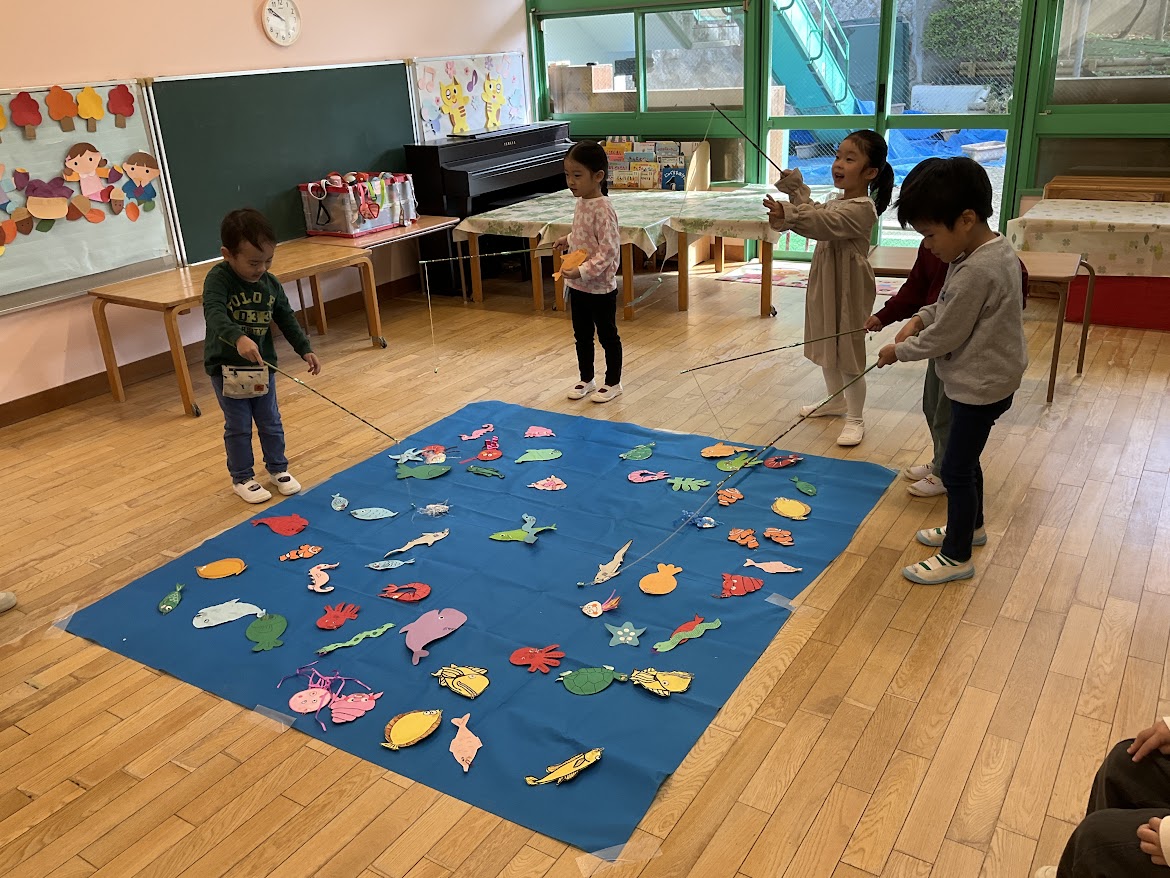 お楽しみ会をいたしました。いつもの幼稚園とは違い、輪投げや宝さがしやボウリングがあるゲームコーナー、魚釣りコーナー、園長先生のお話のお部屋、工作コーナーができあがっていて、朝登園してきたお子さん達は大興奮でした。皆が揃い9時30分に一斉にスタート、クラスごとに一つずつのコーナーを回っていきます。それぞれのコーナーを、お友達と順番を守りながら楽しみ、最後にはお楽しみカードに先生からスタンプをもらいました。宝探しで見つけたタンバリンのおもちゃや、工作コーナーで作ったものはプレゼントとして持って帰ることができました。お家で見るたびに、また今日のことを思い出してもらえると嬉しいです。楽しく特別な1日を過ごすことができました。