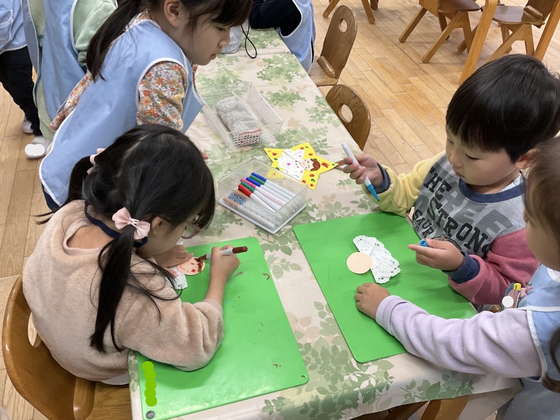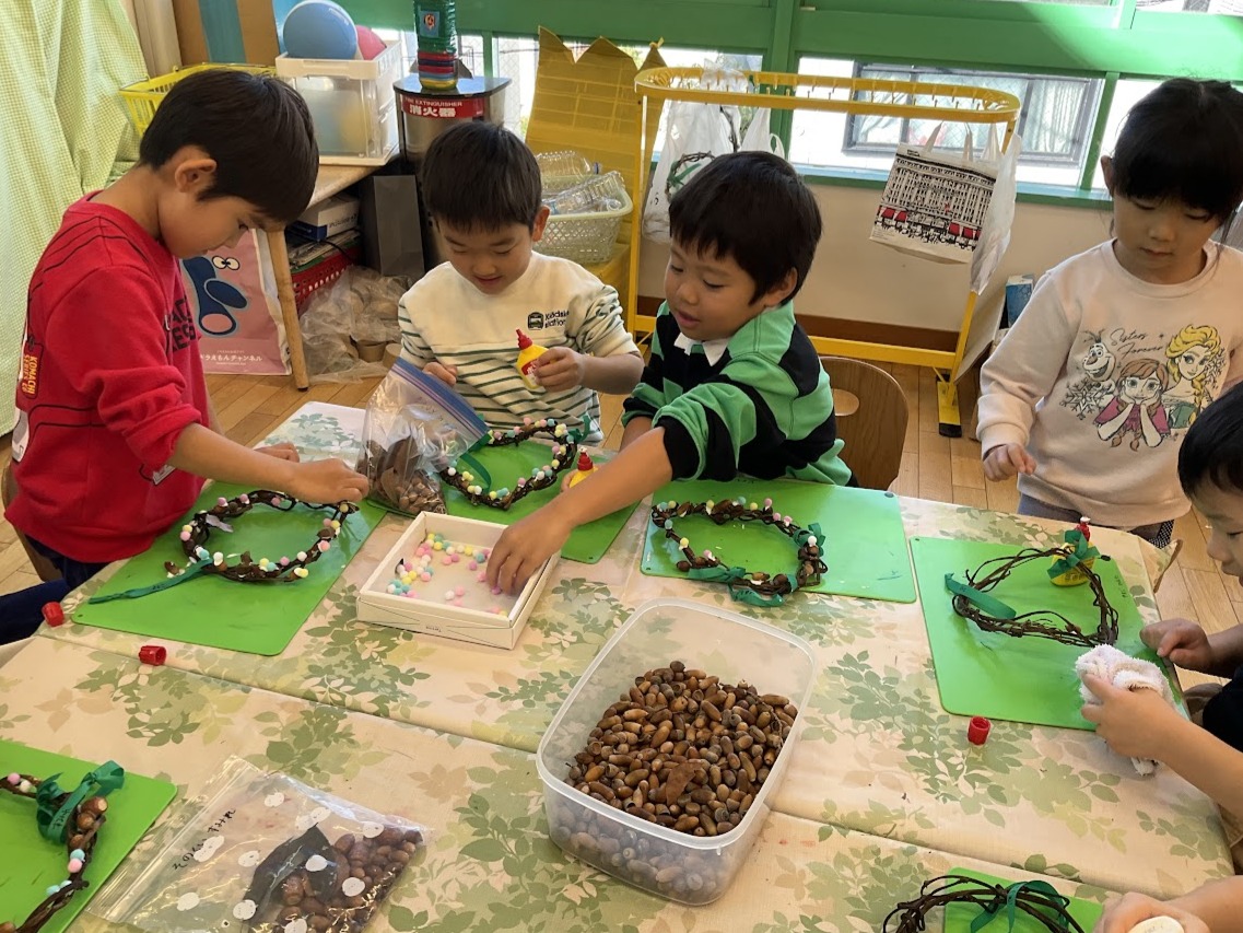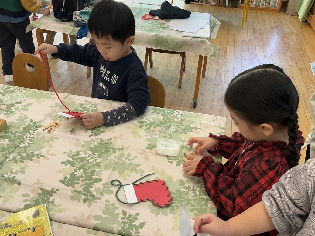 クリスマスに向けた製作活動をしています。もり組(年少組)はレースペーパーのお洋服を着た天使にお顔や飾りを水性ペンで描き、指絵の具をスタンプした星型の台紙に貼った飾りを作りました。おひさま組(年中組)は、色画用紙のブーツのふちを毛糸で穴通しをして、お顔を描いたトナカイを貼った飾りを作りました。こばと組(年長組)は、秋の園外保育で収穫したさつまいものつるを巻いて輪にし、親子遠足などで拾ったどんぐりや葉や実を飾り付けてクリスマスリースにしました。各学年によって様々な素材を使って、楽しみながら素敵な飾りを作る姿が見られました。