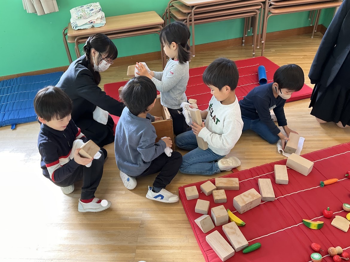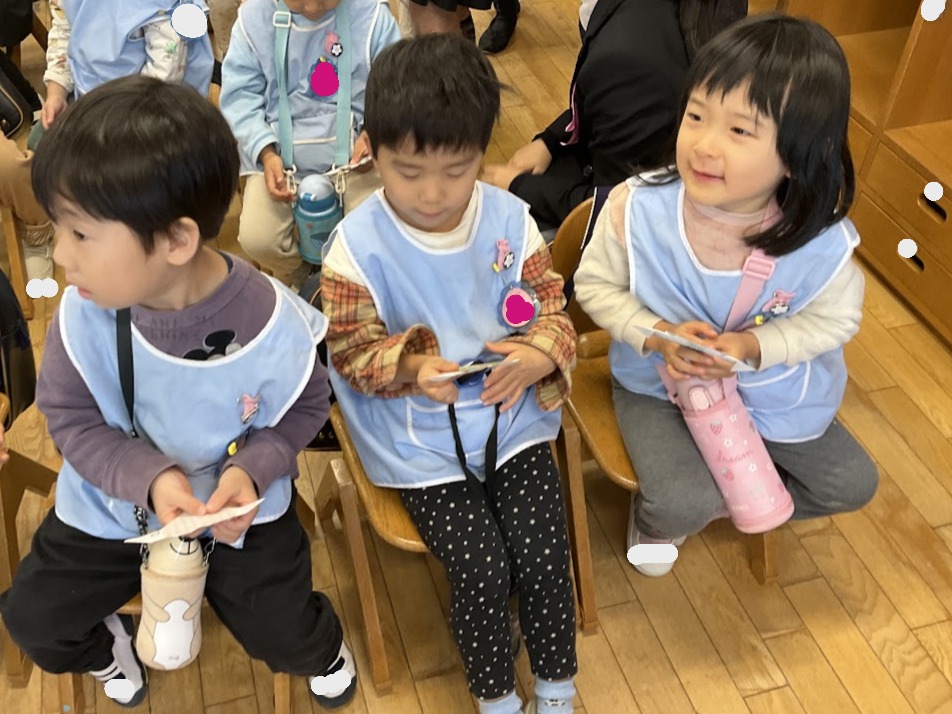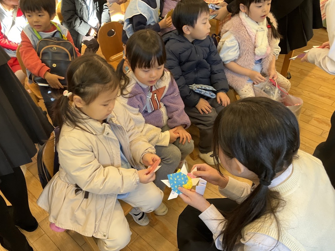 共立女子高等学校のお姉さま方があそびにいらっしゃいました。今回は大掃除の日と重なって、一緒に掃除をお手伝いくださったり、鬼ごっこをしてくださったりして、楽しい時間を過ごすことができました。お帰りの時には、可愛いハートに羽がついた折り紙のプレゼントを1人ずついただき、すぐにお友達との見せ合いっこが始まって、大喜びのお子さん達でした。