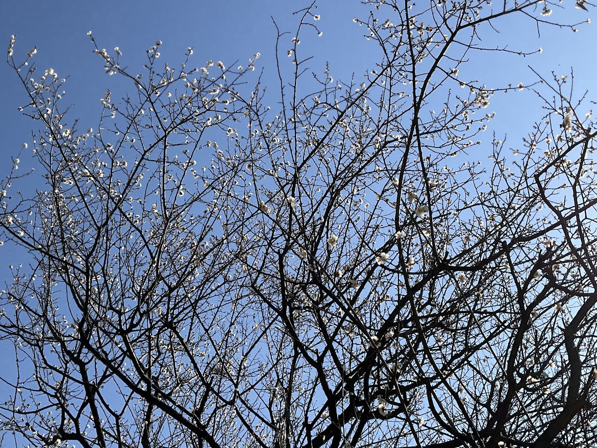 園庭の梅の花が咲き始めました。幼稚園のお庭には、白とピンクの花が咲く梅の木があります。今年は先に白が咲きました。