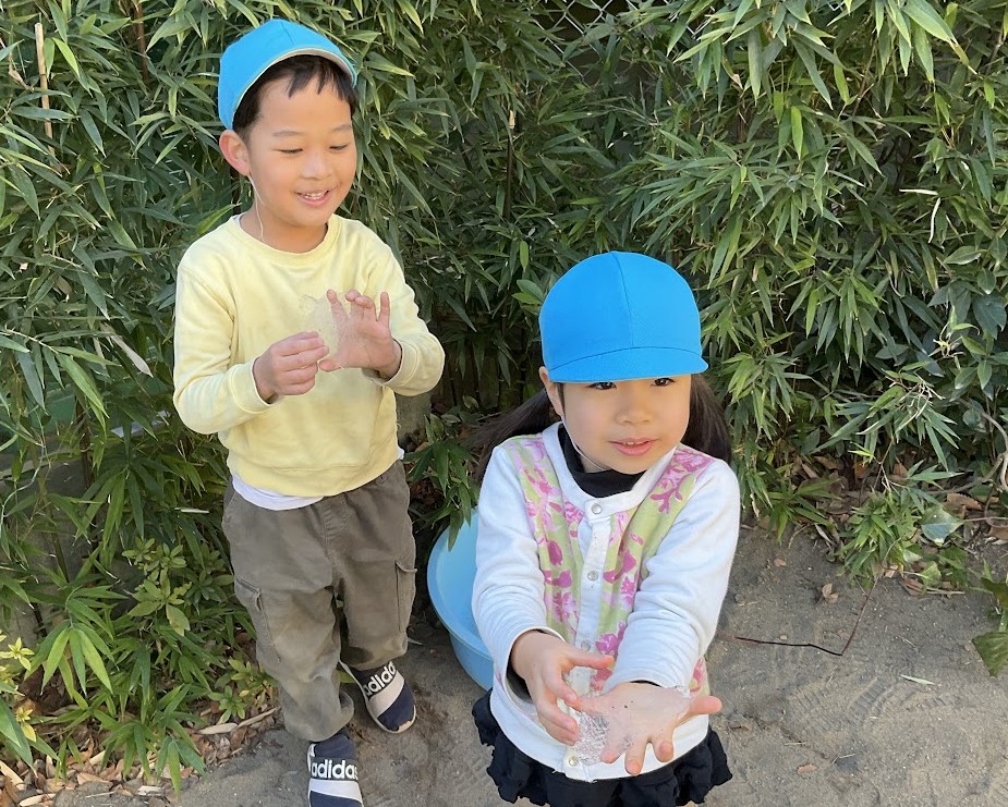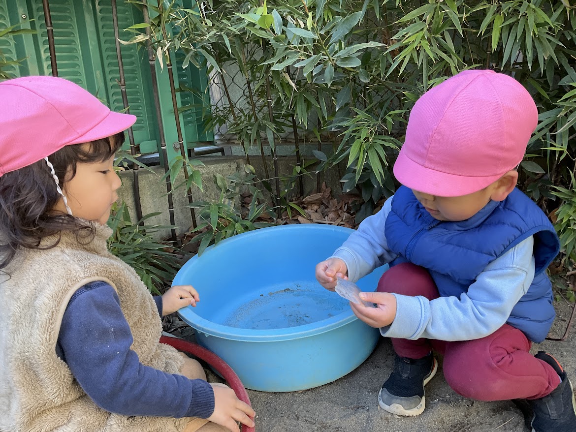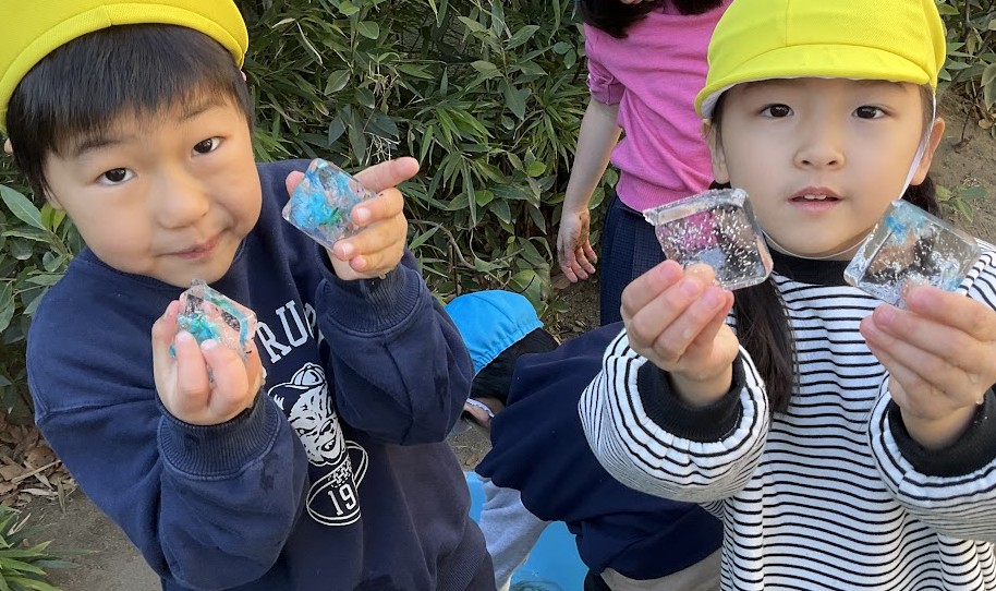 おひさま組(年中組)は、花びらを入れてお花の氷を作っていました!