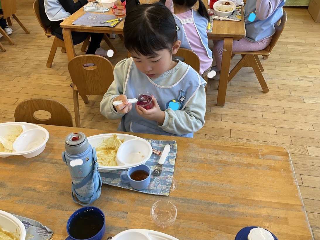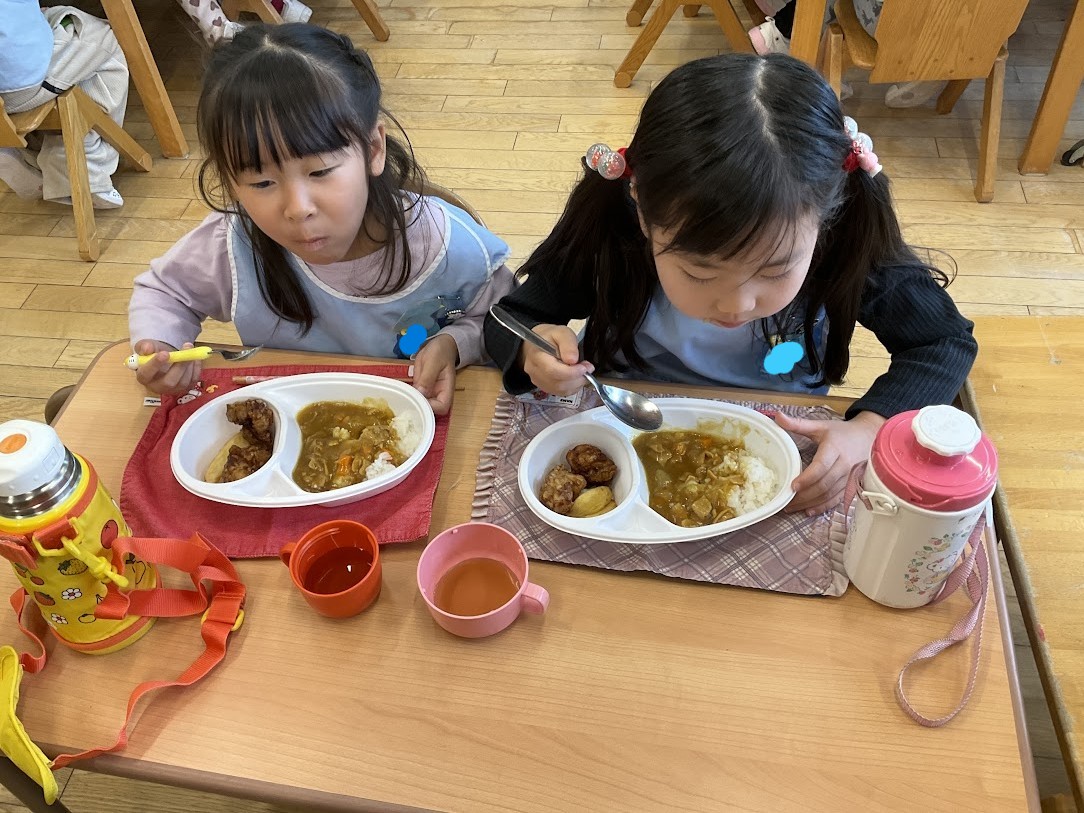 4月から小学生になるこばと組(年長組)が、就学前の取組みとして、皆でお昼にカレーをいただきました。いつもはお弁当を持ってくるのですが、この日は「給食」として、皆で同じものをいただきます。朝からとても楽しみにしていたお子さん達。いざお昼の時間になると準備もとてもスムーズに行っていて、元気よく「いただきます」をすると、「おいしい!」「唐揚げもポテトもついてる!」「先生、カレーおいしいよ!」と、喜びの声があちらこちらからあがっていました。ぶどうゼリーのデザートもついていて、皆大満足でした。小学校の給食では、苦手なものが出ることもあると思いますが、皆で同じものを食べる嬉しさや楽しさを経験できたことは、とても良かったと思います。