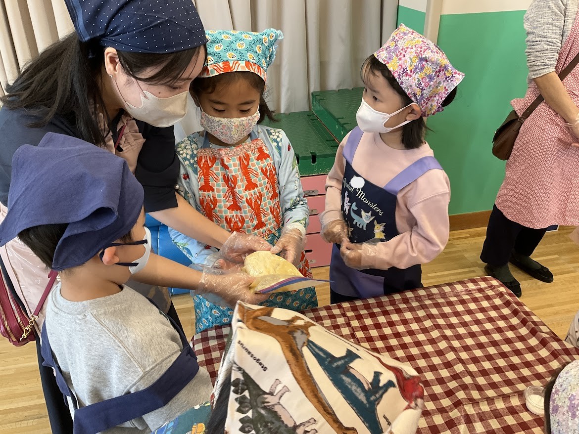こばと組(年長組)が、お母様方と一緒にクッキーを作りました。まず、生地を作るところから始め、小麦粉と、バターと、牛乳を袋に入れて、粉っぽさがなくなるまでお友達と順番に揉んで混ぜました。「強く握りすぎると、袋が破けてしまうから気を付けてね」「手の温かさで、バターが溶けるように優しくする方が、良く溶けますよ」と、コツをお母様に教えていただきながら、おいしくなーれという気持ちを込めて一生懸命混ぜていました。出来上がった生地を、めん棒で丁寧に伸ばして、型を取りました。もり組(年少組)の木、おひさま組(年中組)の太陽、こばと組(年長組)の鳩の形があって、「クラスの形だ!」「かわいいね」と、喜びの声があがっていました。一人ひとり、好きなトッピングをのせていき、すぐにトースターで焼いていただきました。焼きたてのクッキーをひと口食べると、「おいしいね」という声があちらこちらから聞こえてきて、とても楽しい時間となりました。最後に、色々と優しく教えてくださったお母様方に皆でお礼を言って終わりました。クッキー作りが終わった後も、幼稚園がクッキーの香ばしい甘い香りが残っていて、他のクラスのお子さんからは、「いいにおい~」「おなかすいてきちゃった」という声が聞こえていました。また、おひさま組(年中組)のお子さんは、「こばとになったら作れるんだ、楽しみだね」と言う人もいて、年長組への憧れや楽しみに繋がっていかれると良いなと思いました。